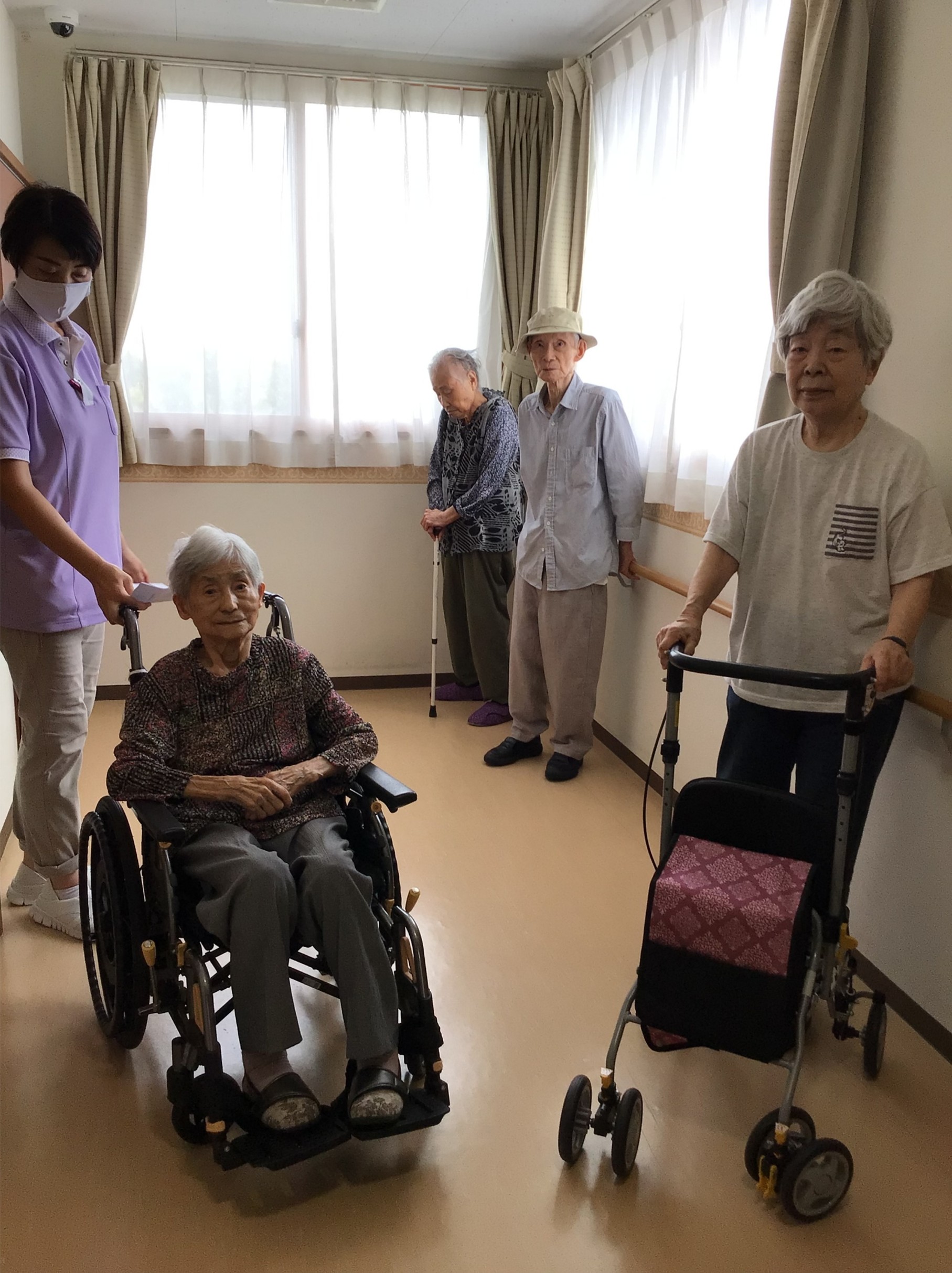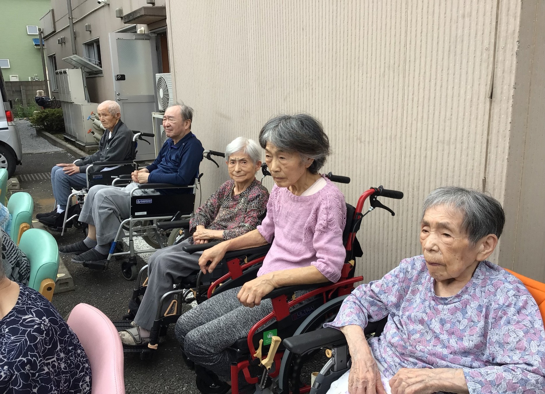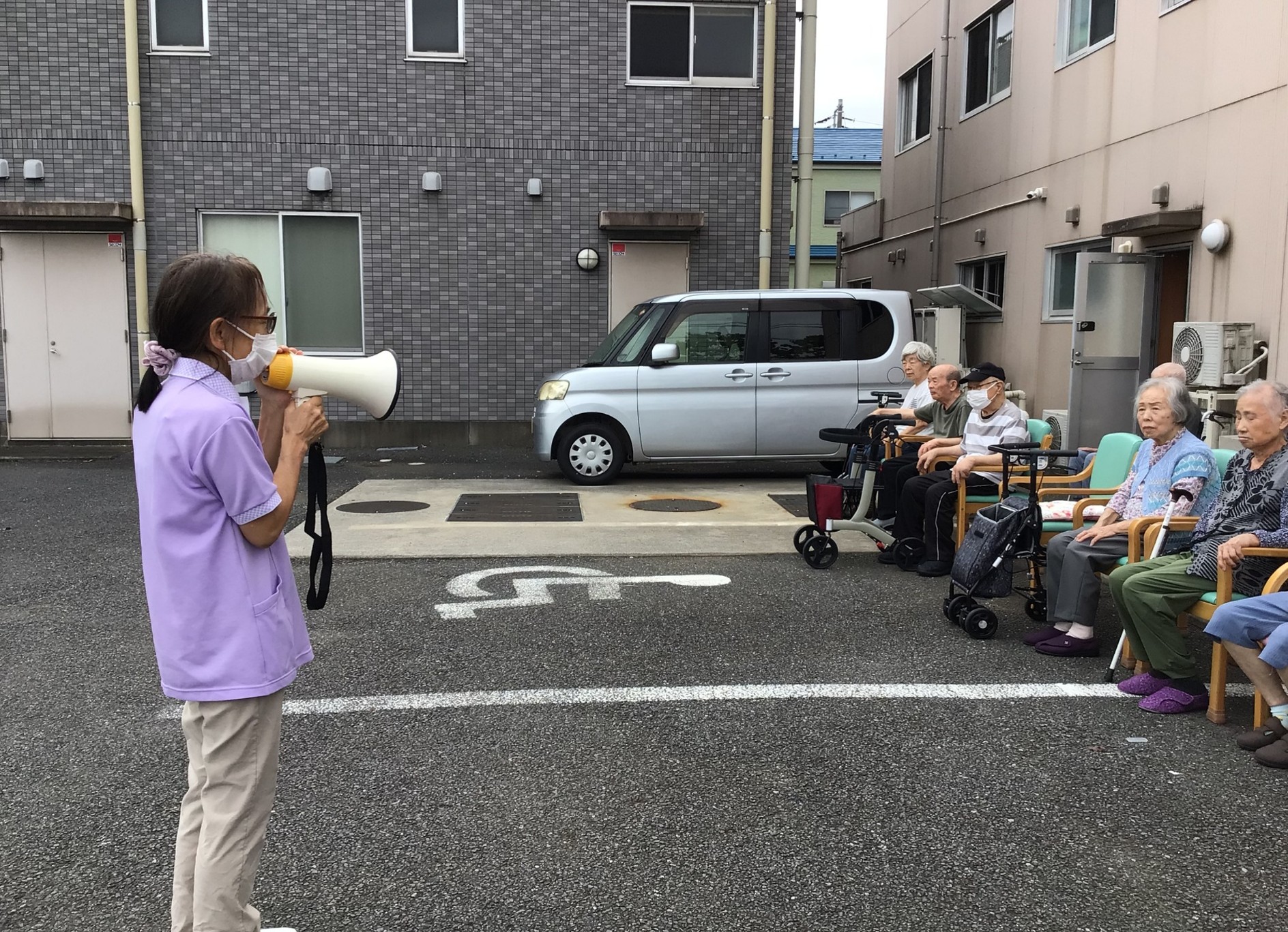 施設内での火災発生を想定し、入居者の皆さんには建物の外へ避難していただきました。