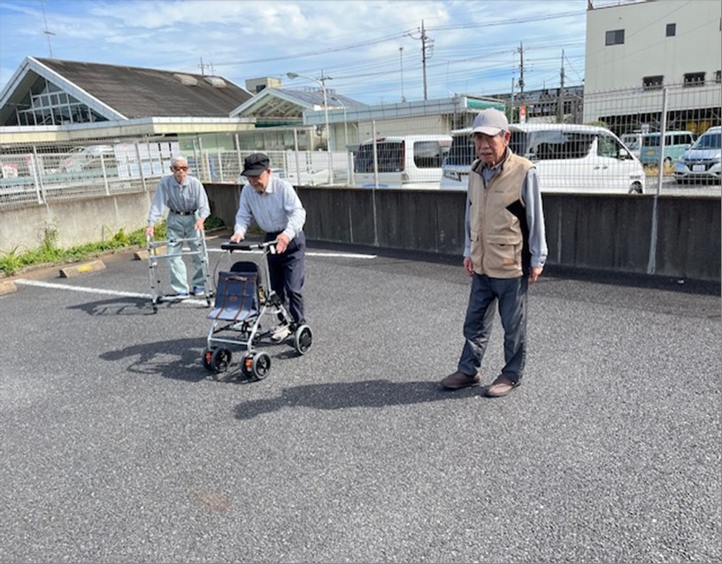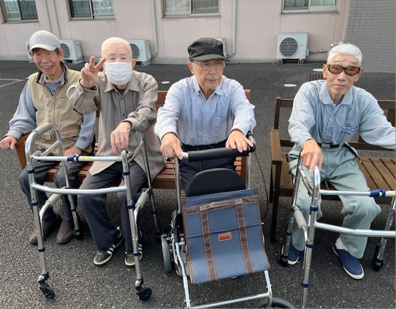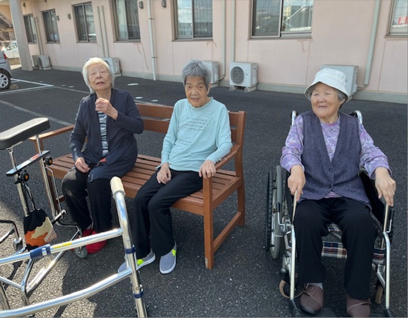 ベンチに座っておしゃべりしたり、歩行器や車椅子で駐車場の軽度な坂を登ったり下りたりしながら歩いたり、各々散歩を楽しんでいました。