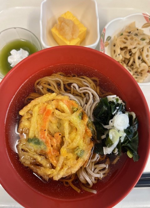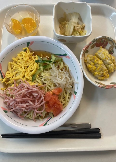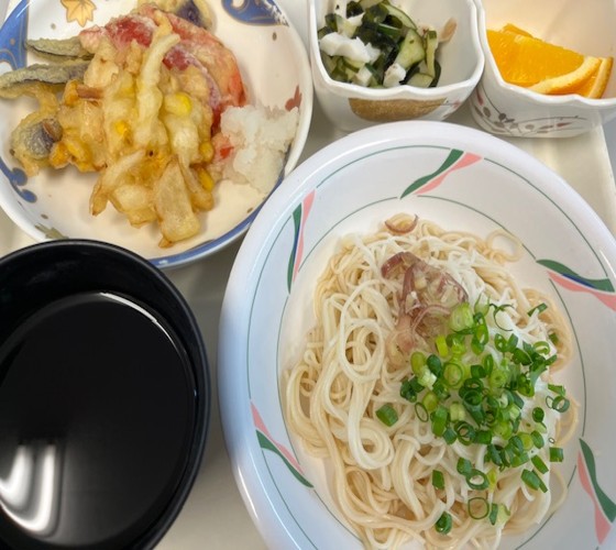 お盆メニューのそうめん、夏野菜の天ぷら(トウモロコシのかき揚げ、パプリカ、ナス)