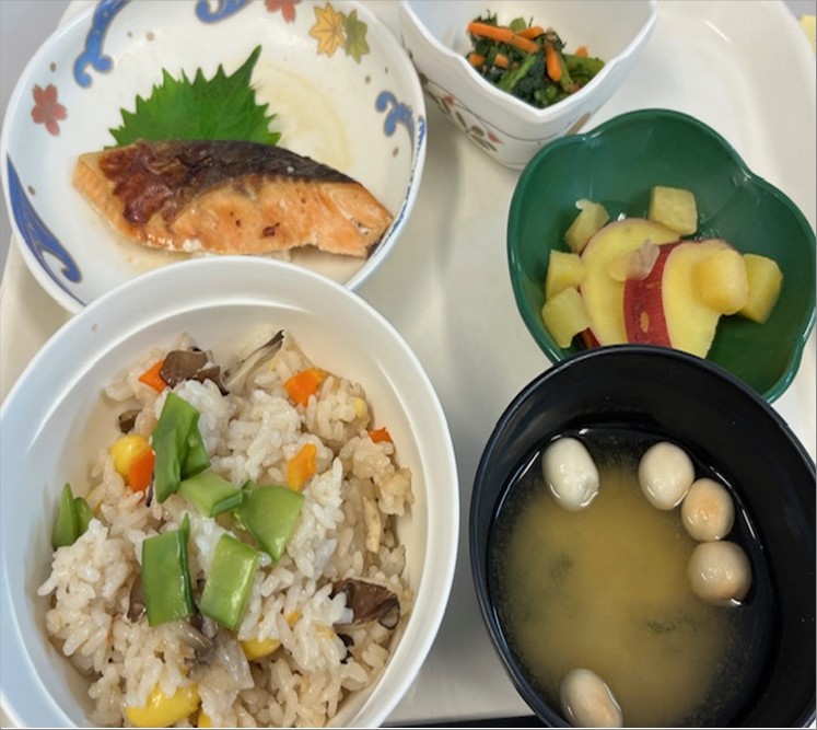 秋分の日は炊き寄せご飯、マスの塩麹焼き、さつま芋のリンゴ煮、春菊のおかか和え