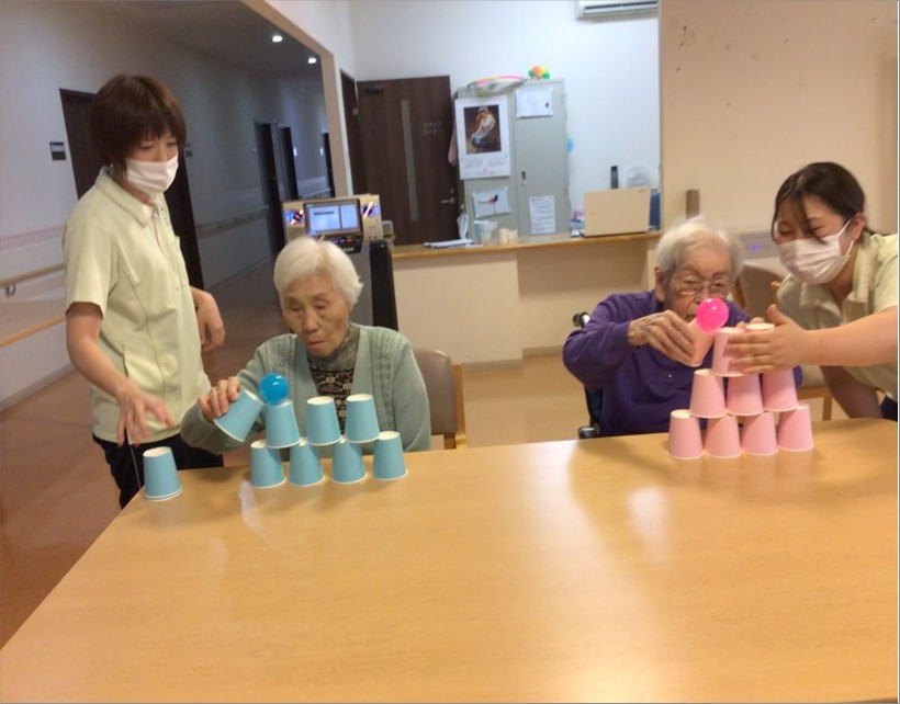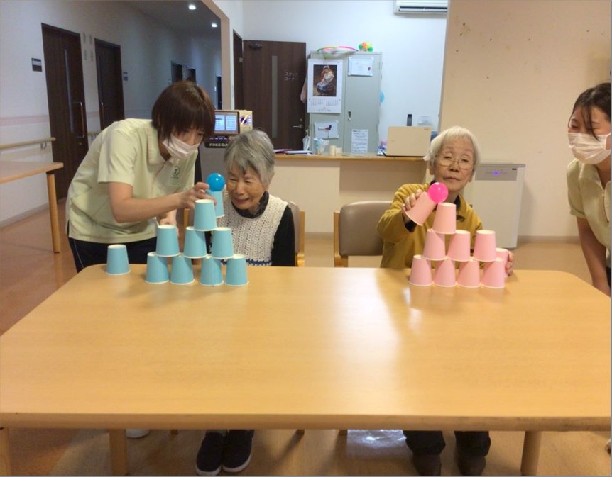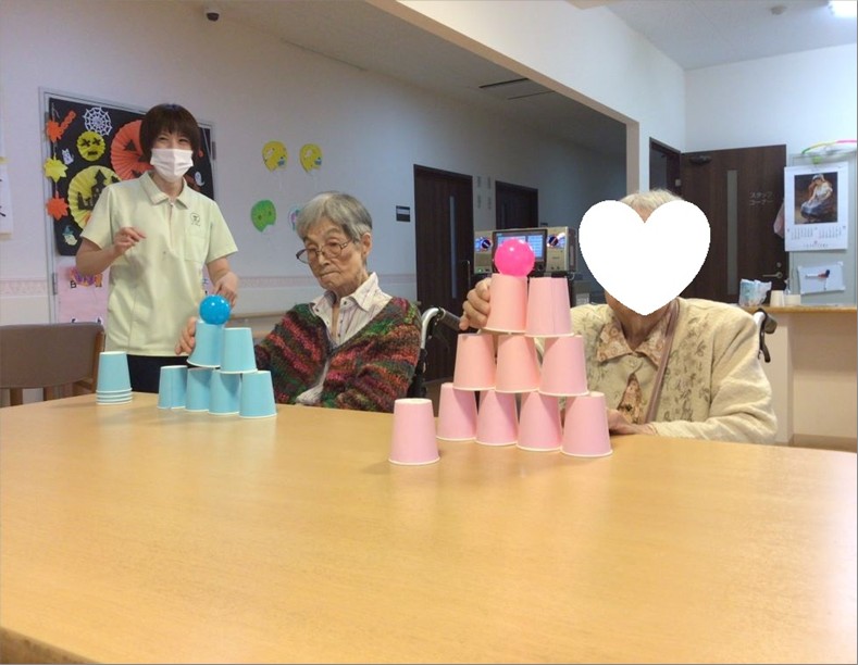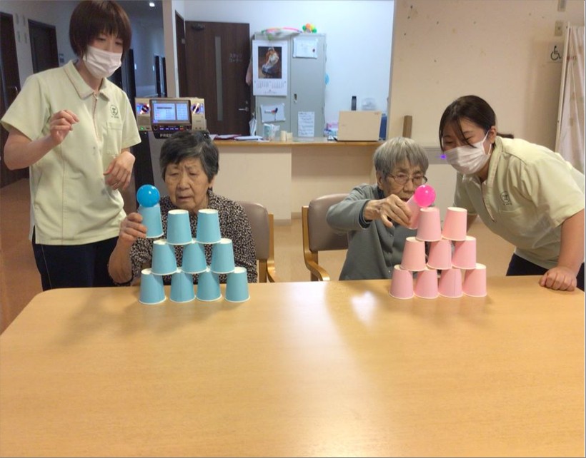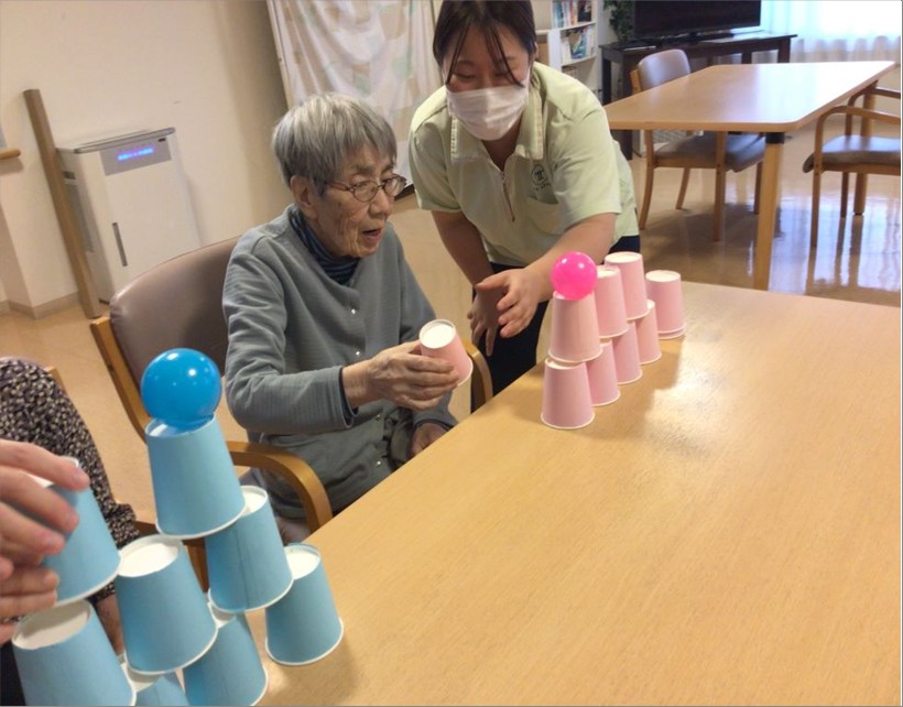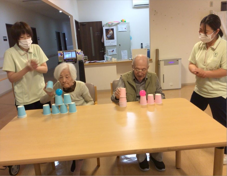 レクリエーション『ピラミッド型ボール移しゲーム』の様子をお届けします🤗