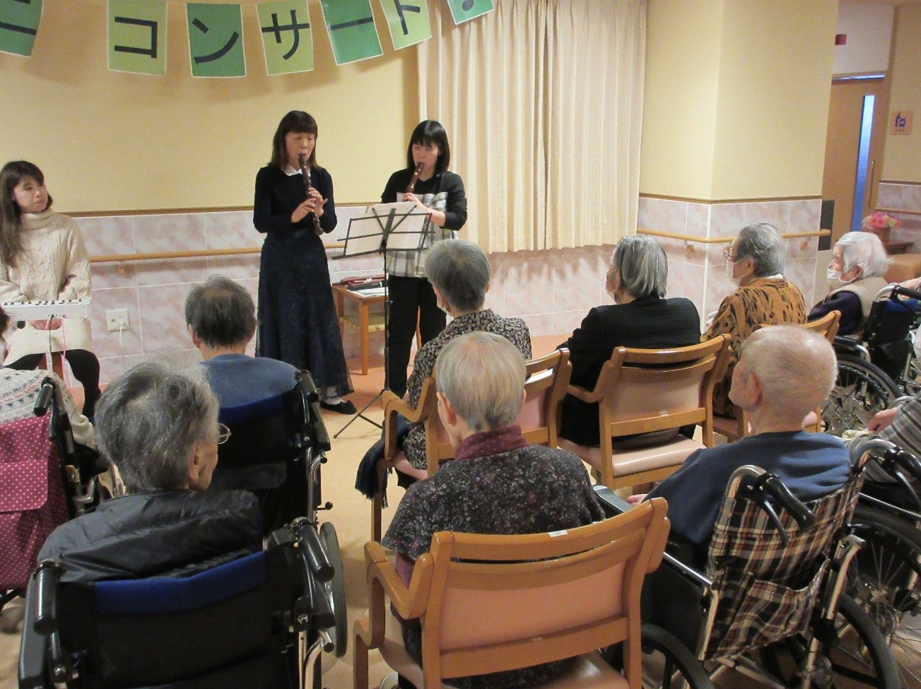 ピアノとアルトリコーダーで秋の曲を演奏してくださり、ご入居者様は目を閉じながらうっとりと鑑賞される方や 一緒に口ずさむ方、それぞれの音楽の楽しみ方で秋のひと時を満喫されていました(^^♪