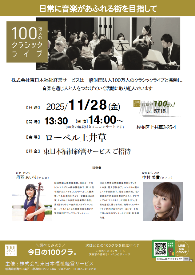 『100万人のクラシックライブ』様は、日常に音楽があふれる街を目指されており、「クラシック音楽を通じた感動の共有」「演奏家と社会をつなぐ演奏機会の創出」「地域コミュニティの活性化」をコンセプトに活動を行われております。