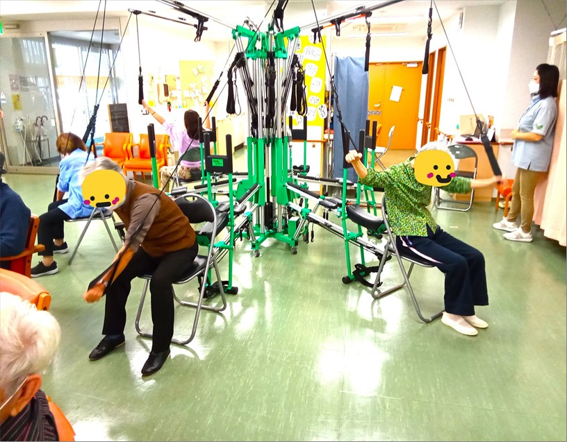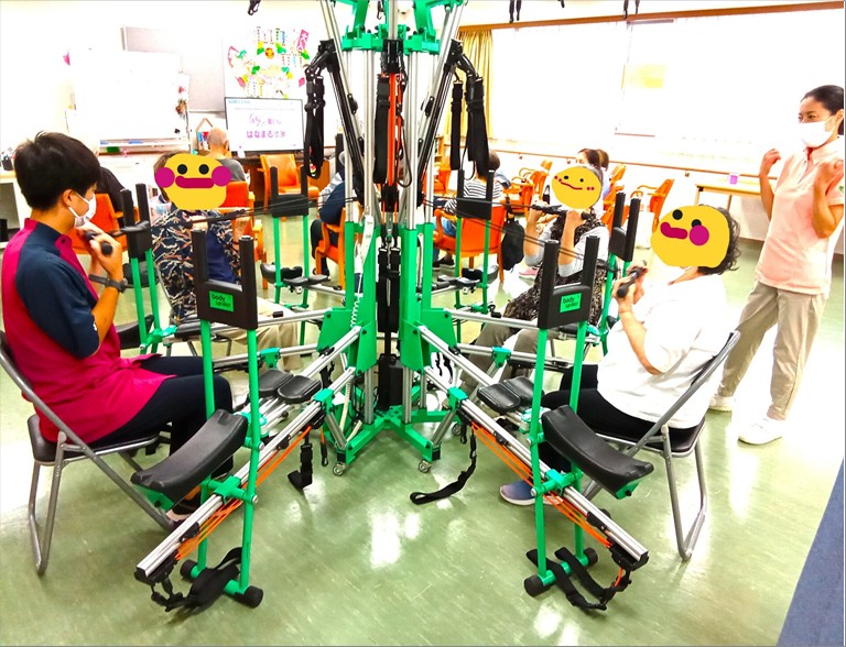 ボディスパイダーを使った負荷のかかる運動と、椅子に座って行う集団体操を組み合わせ、それぞれが「できる範囲で無理なく」続けられるよう工夫しています。