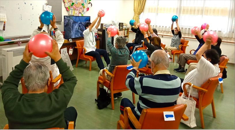 運動の時間は元気なスタッフとリハビリの専門家である理学療法士がサポート。