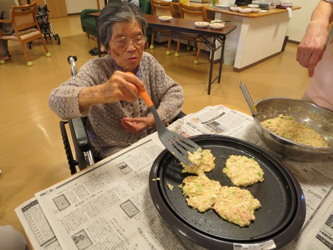 お好み焼きの生地は職員が作りましたが、ホットプレートで焼いたりひっくり返したりは入居者様にも手伝って頂きました😊