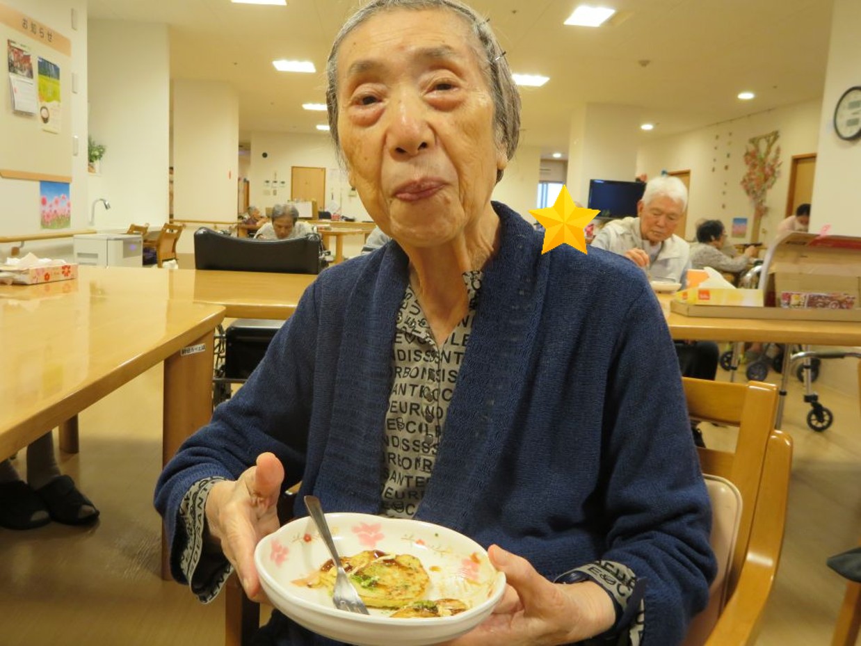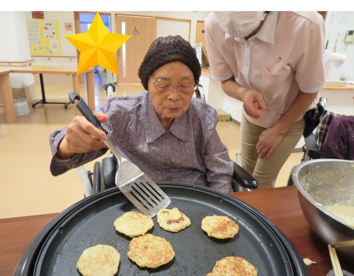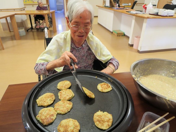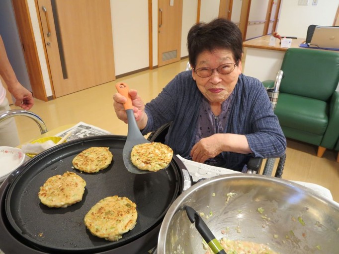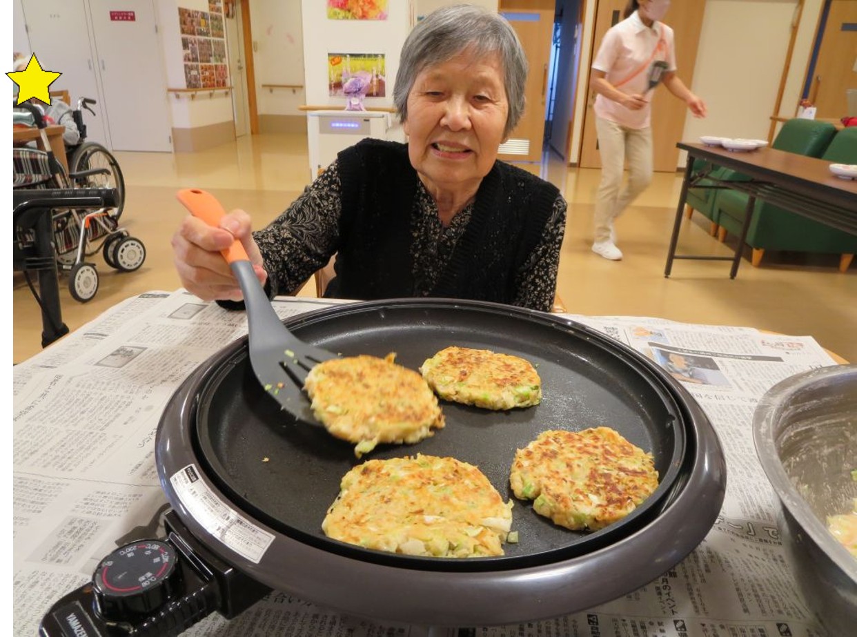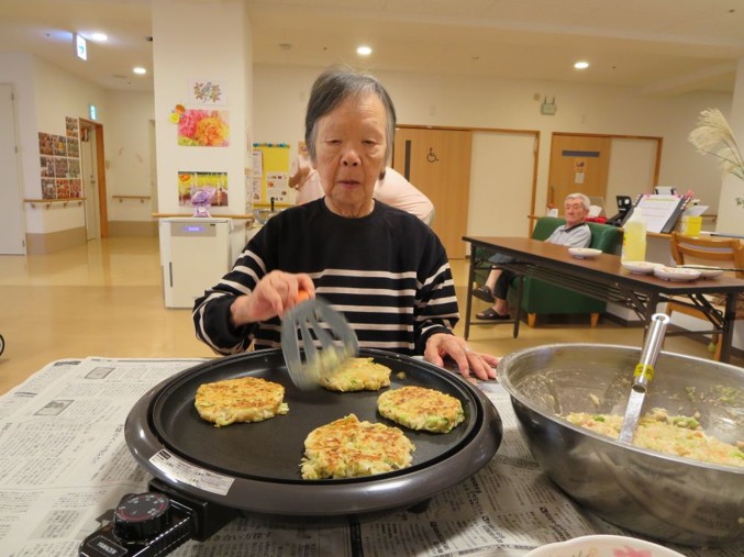 お好み焼きの生地は職員が作りましたが、ホットプレートで焼いたりひっくり返したりは入居者様にも手伝って頂きました😊