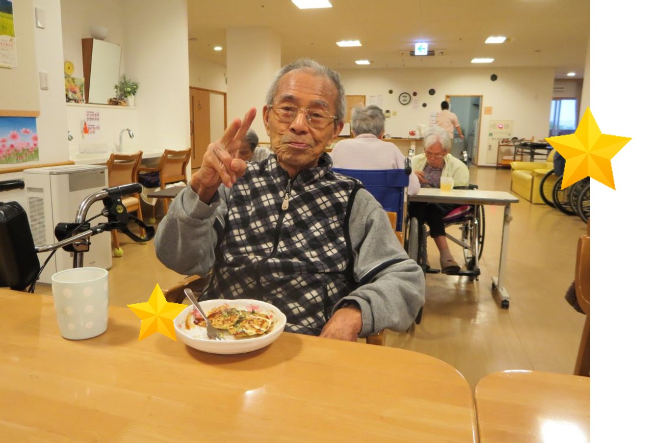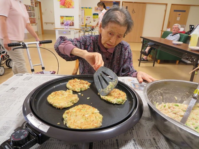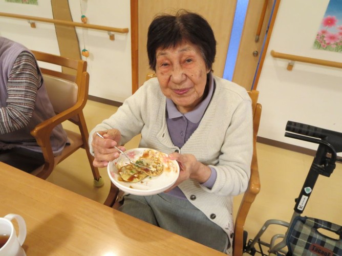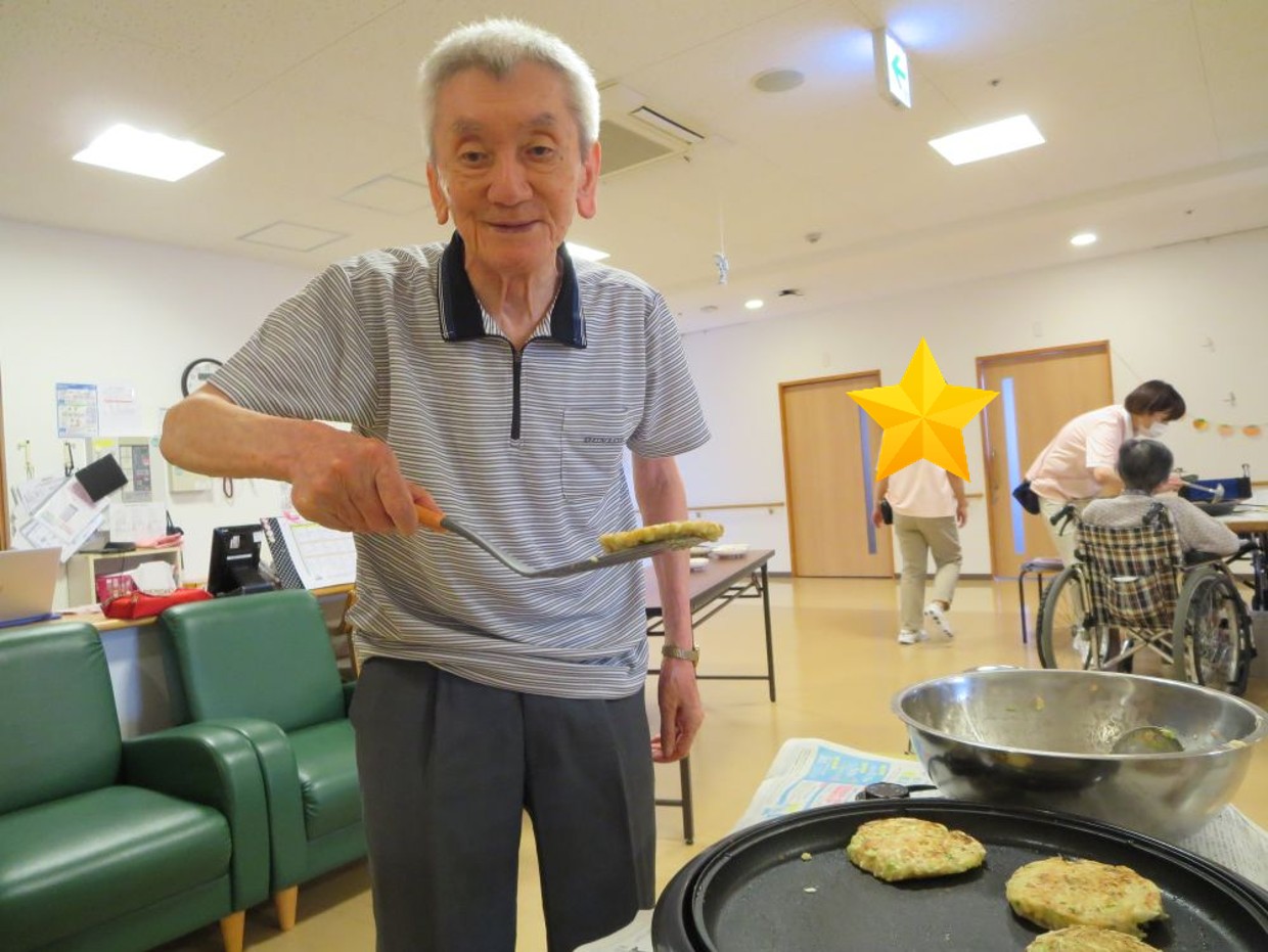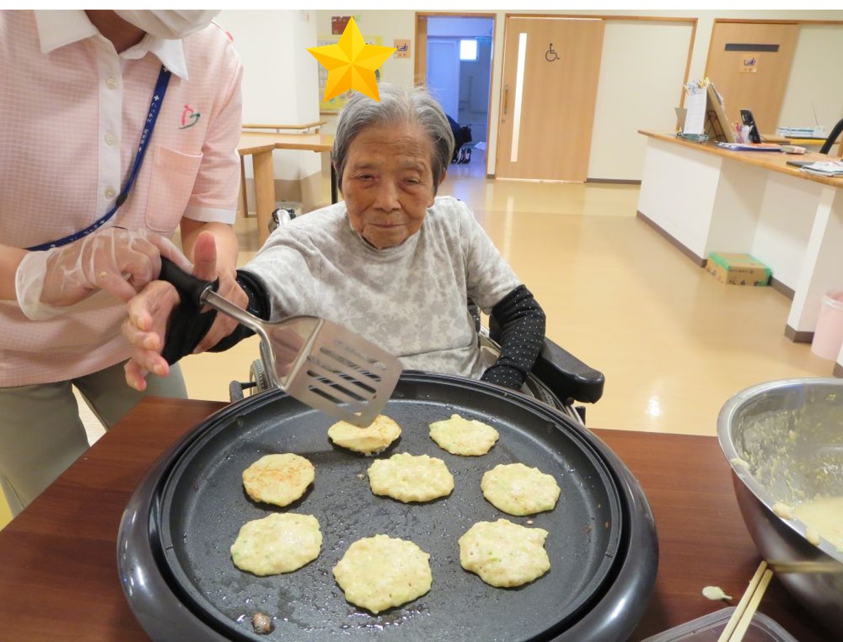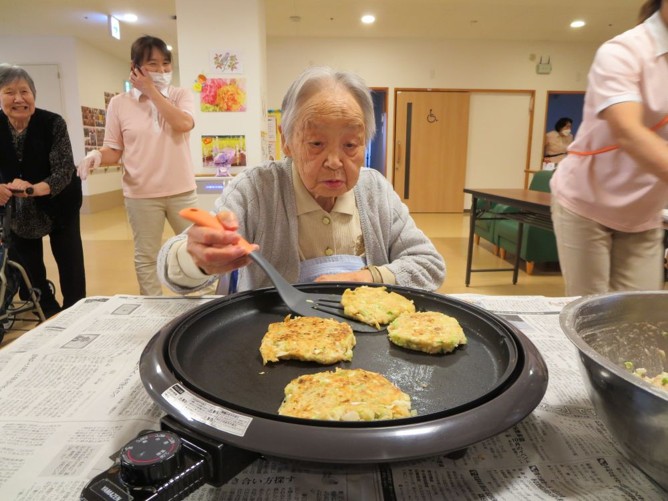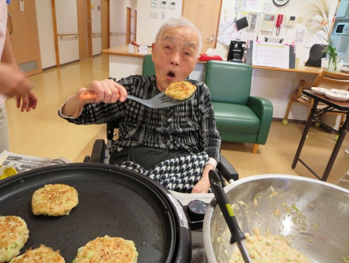 お好み焼きの生地は職員が作りましたが、ホットプレートで焼いたりひっくり返したりは入居者様にも手伝って頂きました😊