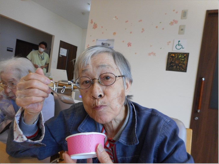 その日のおやつにはご入居者様全員にアイスをお出しし、アイスを食べる姿からも「嬉しい!!」が伝わって来て、職員も「良かった!」と思う瞬間でした!