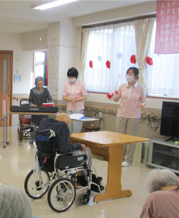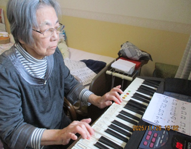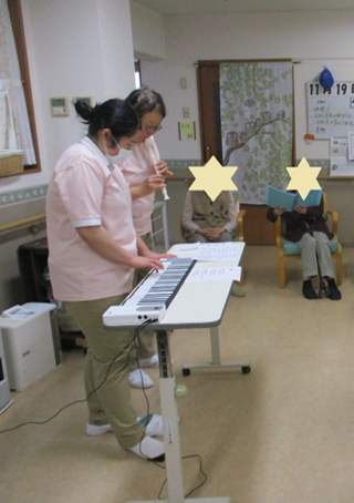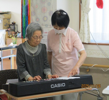 入居者様にキーボードを弾いていただいたり、職員が縦笛を吹いたり…♪♪♪