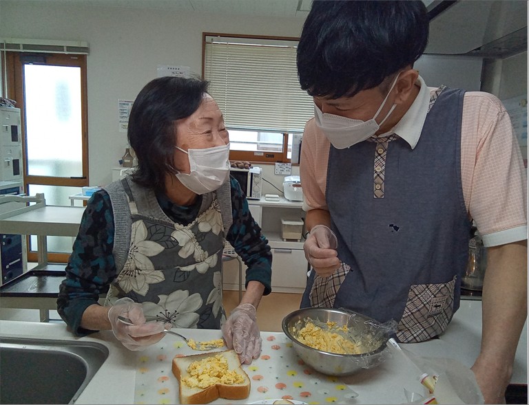 お昼のサンドイッチやサラダの調理を手伝っていただき、おやつの飾り付けを楽しまれました。ご自分で飾り付けたプリンの味はひと味違いますね!