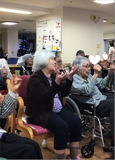 振付けに合わせて入居者様も手を動かします。歌を歌いながら体も動かす!脳トレですね♬🎵