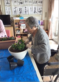 皆さんのお食事をするフロアから見えるようにと、プランターにお花を植えました。