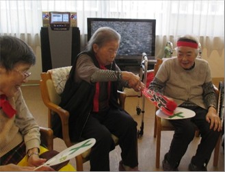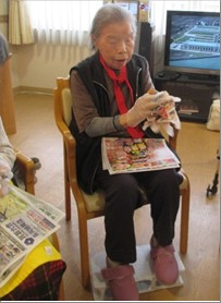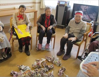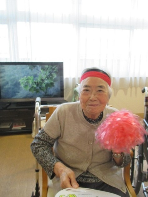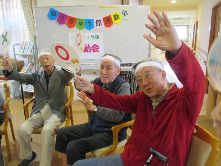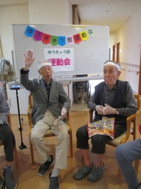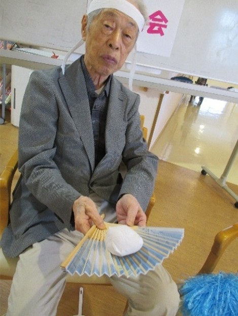 単純なようで難しかったです。職員も間に入り参加しましたがチームの端を引っ張らないように慎重に・・・