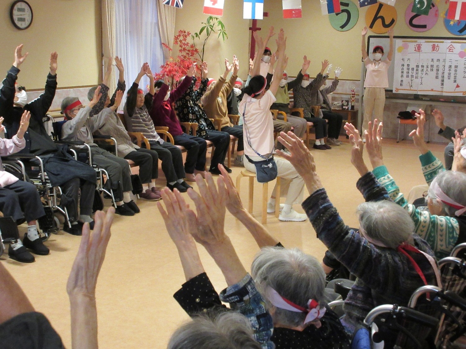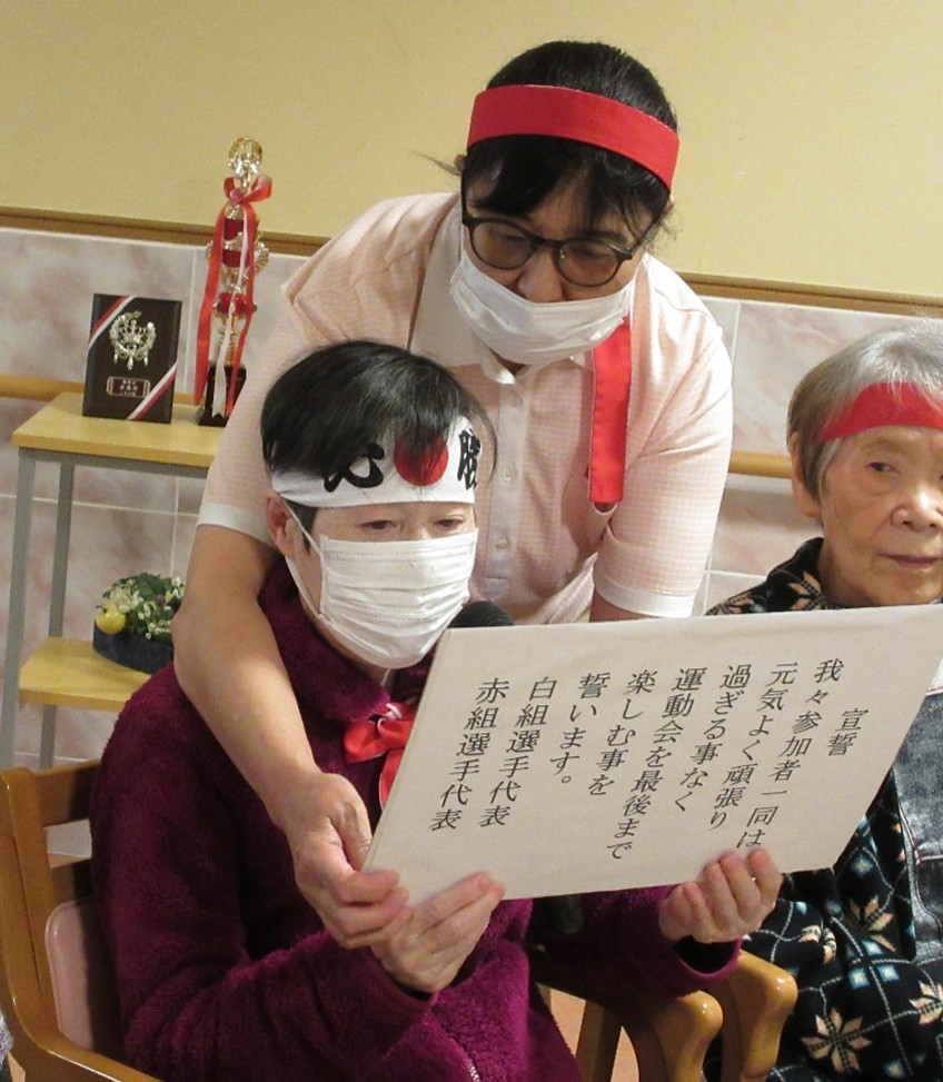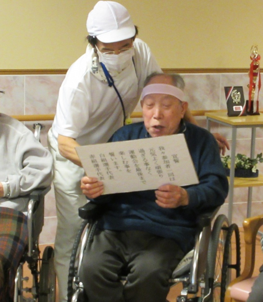 玉入れ、物送り、借り物リレーの3競技を用意し、入居者様による選手宣誓で競技スタートとなりました。