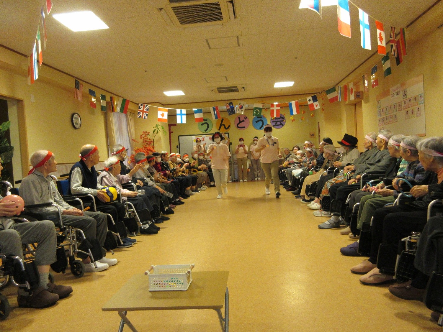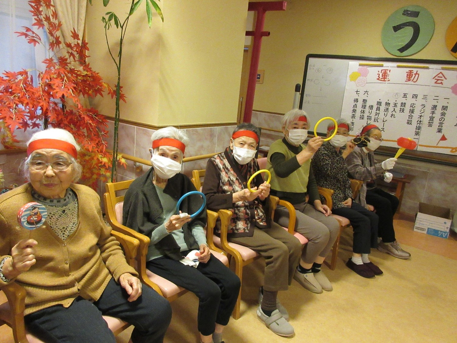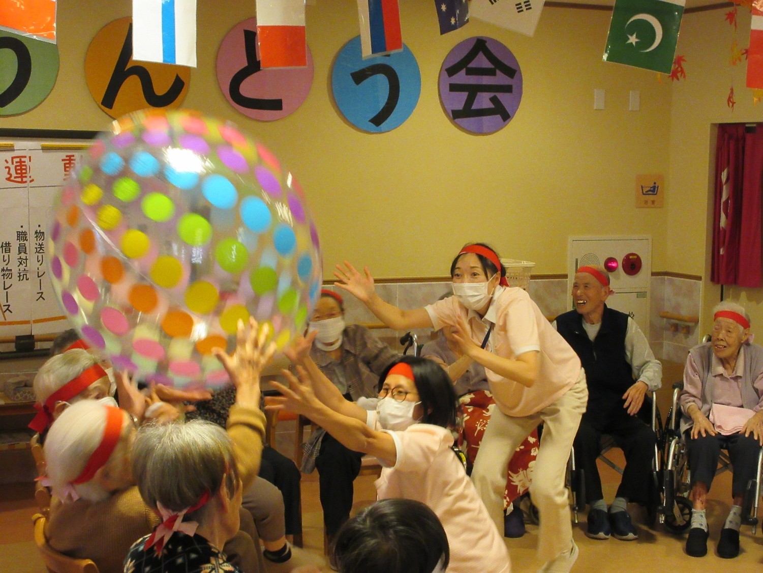 玉入れ、物送り、借り物リレーの3競技を用意し、入居者様による選手宣誓で競技スタートとなりました。