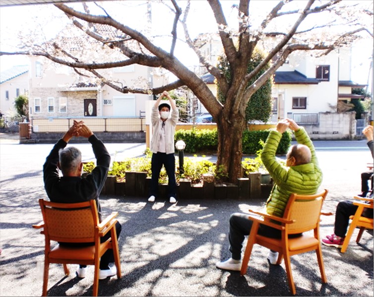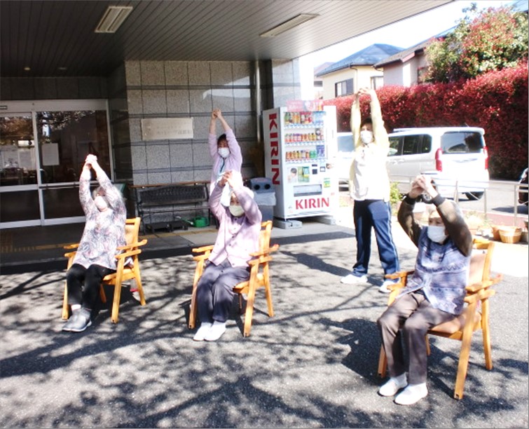 お外に出て行う体操は、いつもと雰囲気も違い、皆さま、いつにも増して伸び伸び行われていました!