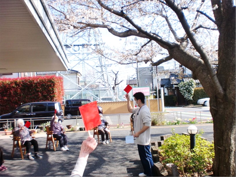 そして今回は、桜の木の下で、体操と紅白旗揚げレクリエーションを行いました!!