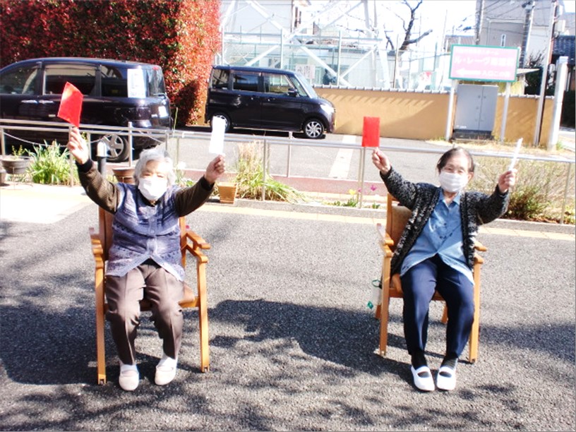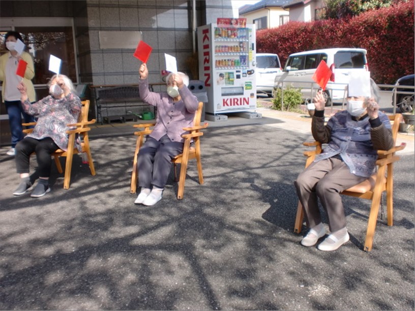体操した後は、レクリエーションを行いました!紅白旗あげゲームです!