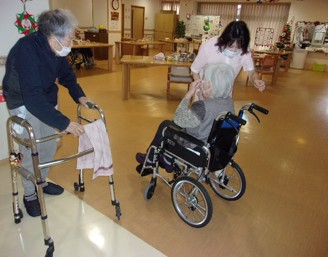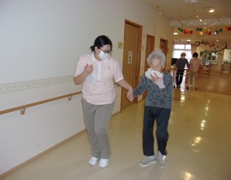 煙を吸わないようマスクやタオルで口を覆い、ご入居者様が慌てないよう声を掛け、無事避難場所までの誘導。