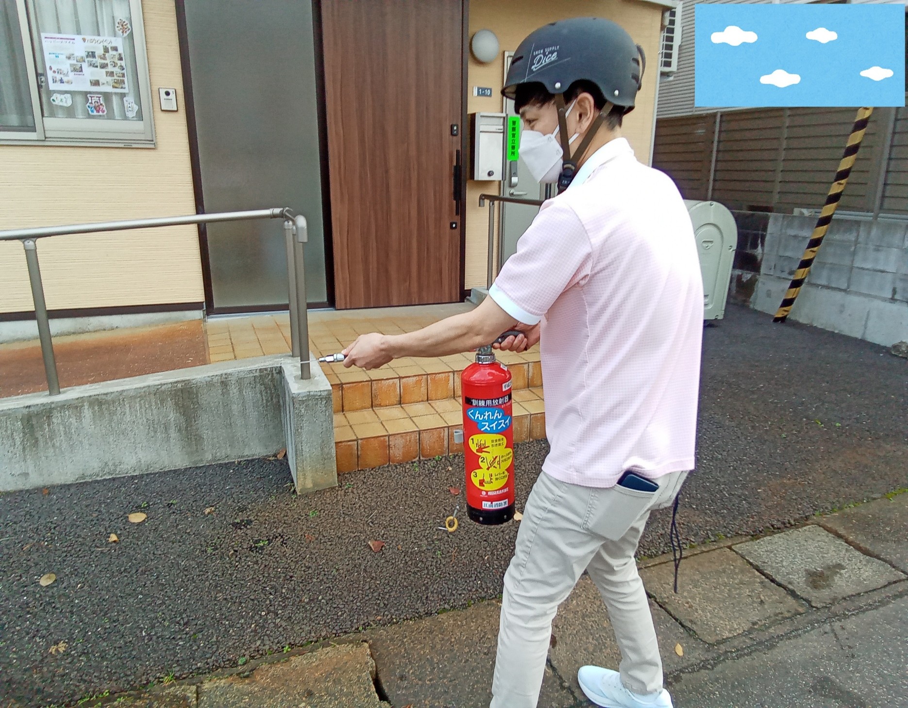 終了後には、消防署からお借りした水消火器を使用して消火器の使用方法の確認を行いました。