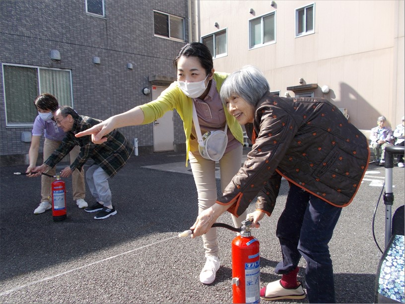 初めての人はおっかなびっくり、職員と一緒に消火器を使ってみました。ちょっとでも触ってみるのはいい経験です。