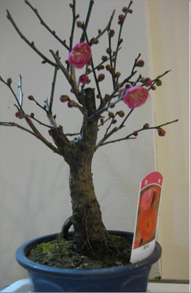 今回は梅の盆栽を飾り毎日いつ咲くかいつ咲くか皆さん楽しみにされていた所になんと1月1日の元旦に2つ咲きました(^O^)/