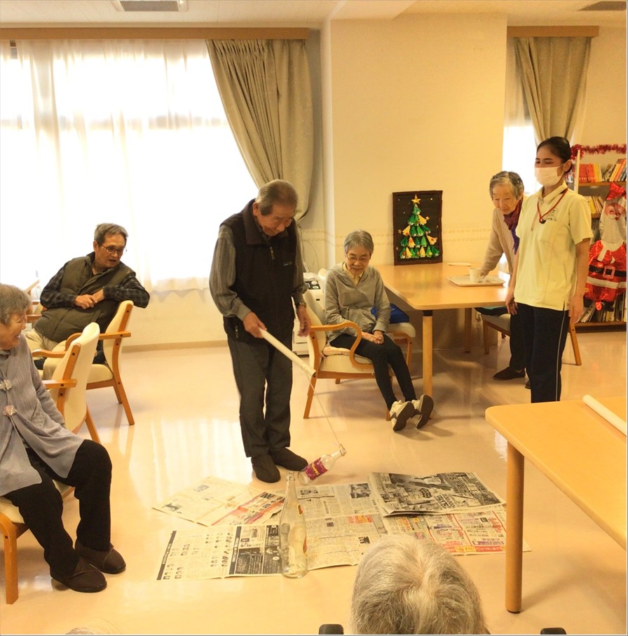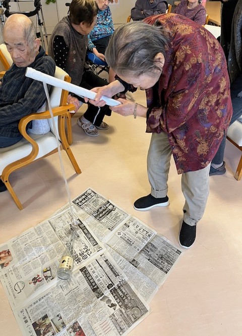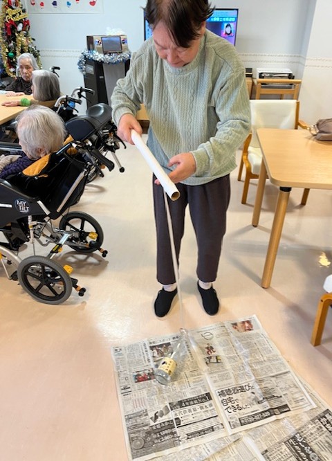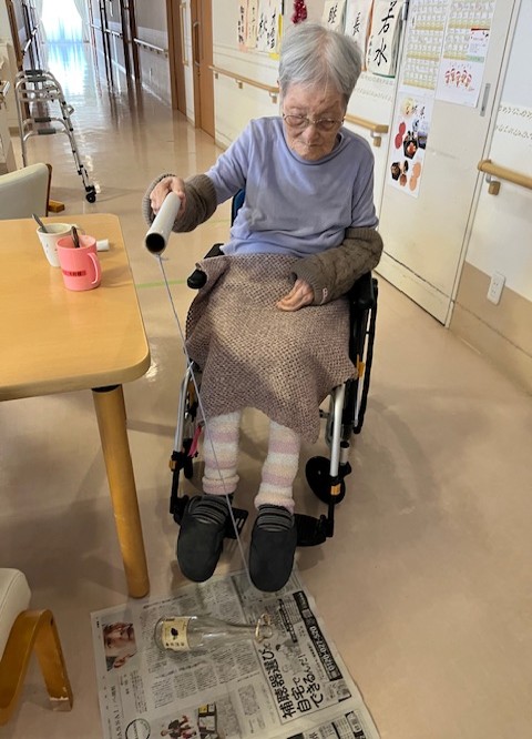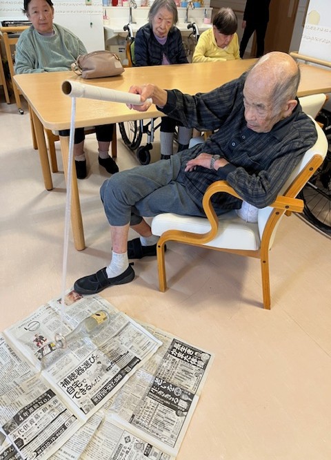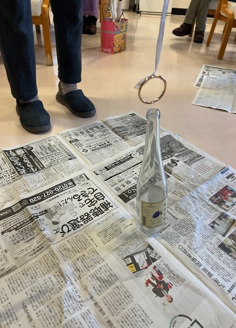 釣酒瓶とは、竿の先にぶら下がった輪っかを寝かせた瓶の口に通して立たせるゲームです😆