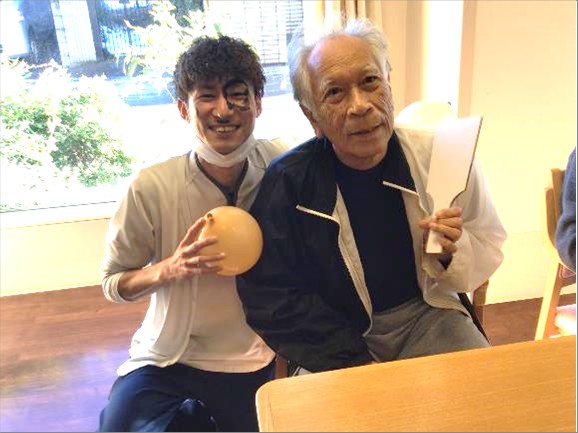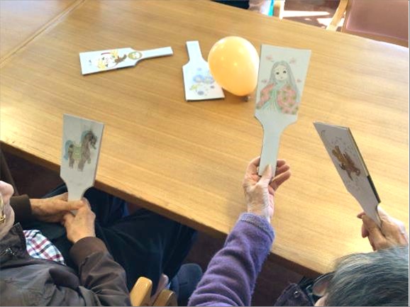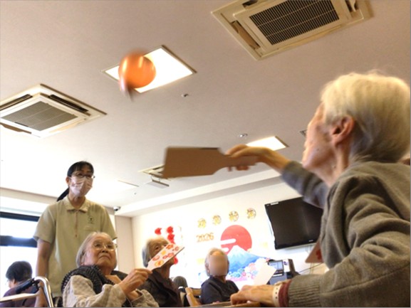厚紙と割り箸で職員がコツコツと職人よろしく手作りし、入居者様がぬり絵やシールで装飾した羽子板で《風船羽根つき》をしました。