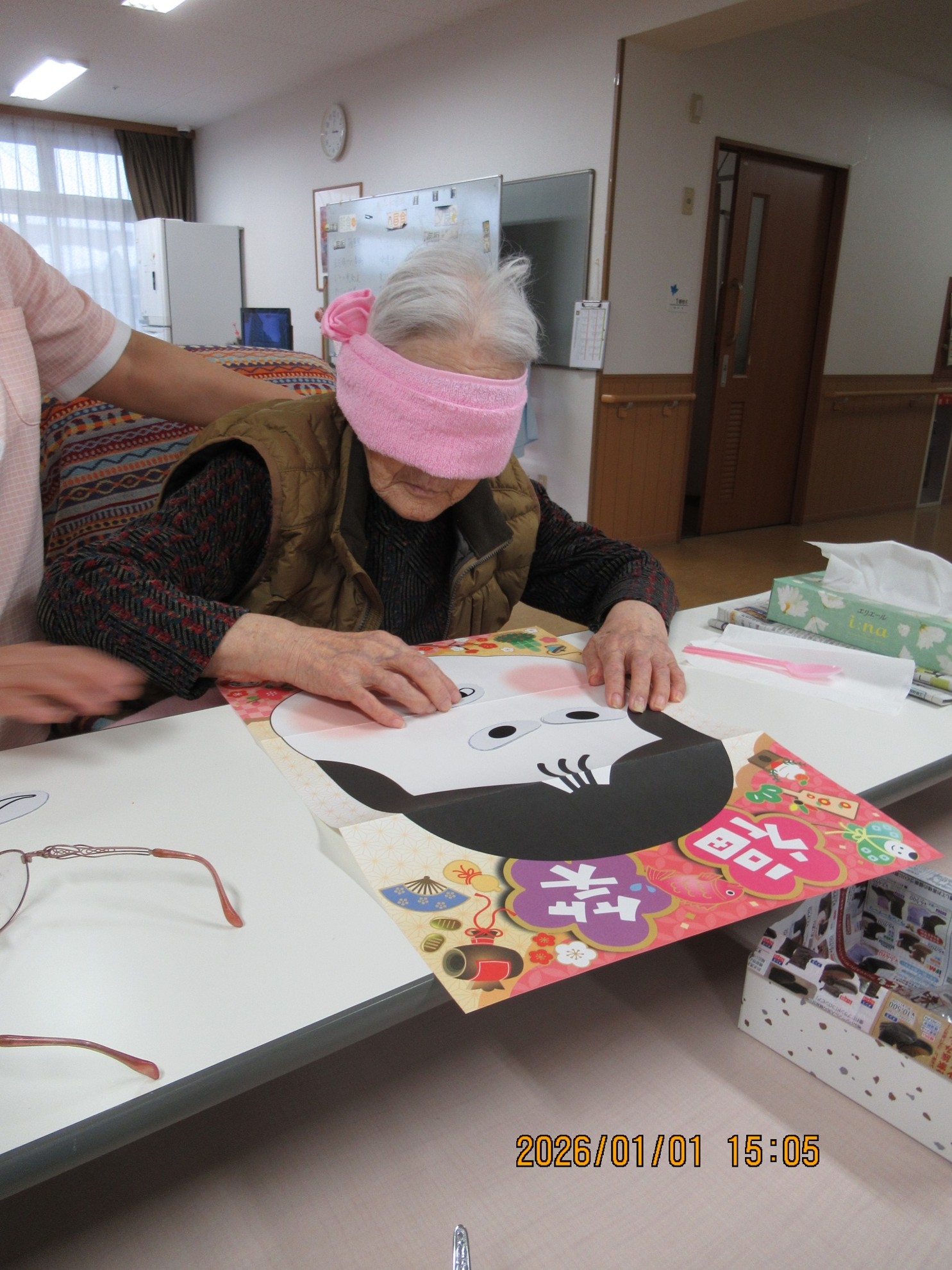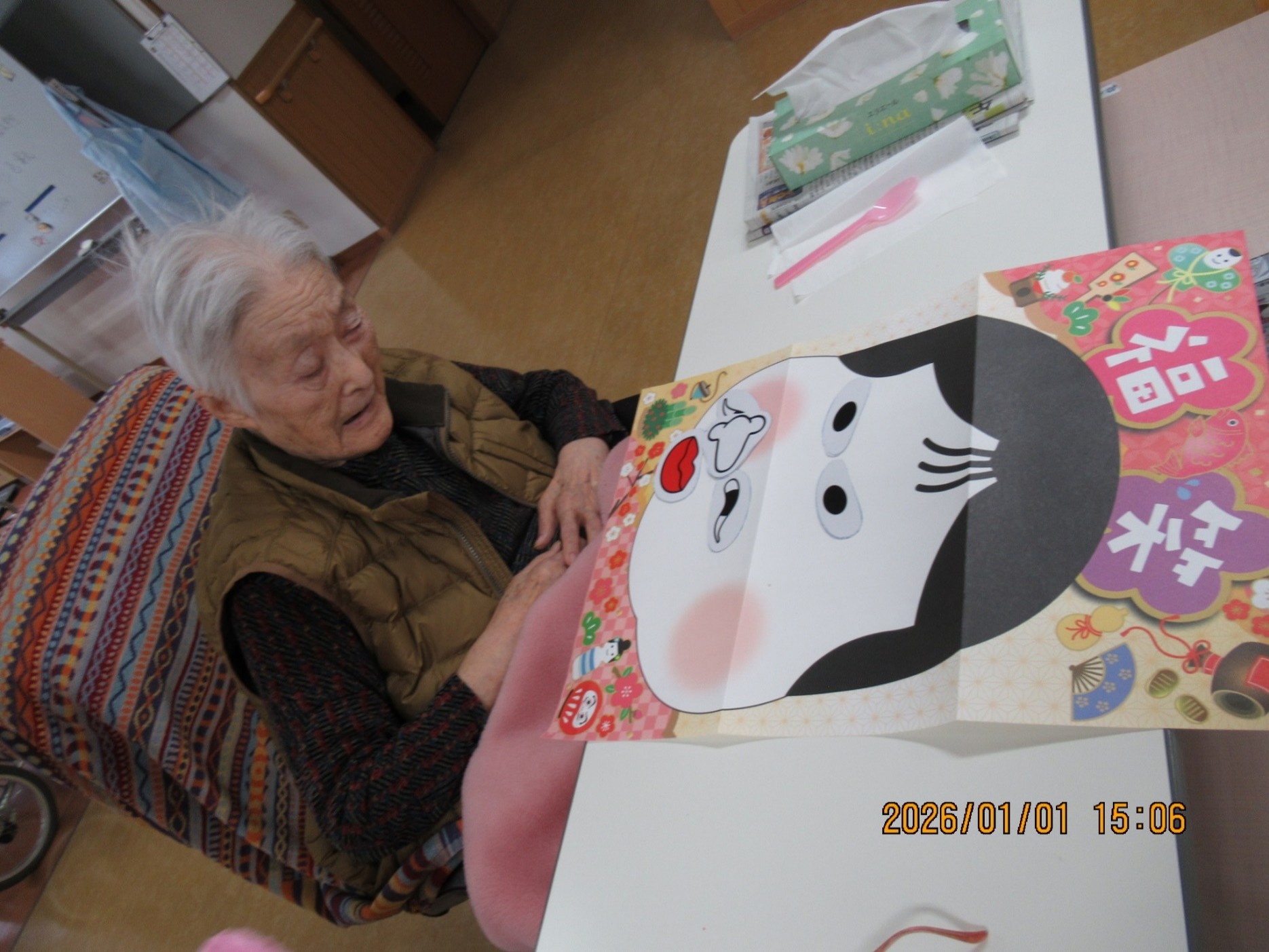 施設内では、元旦に獅子舞、正月飾りや書初め、福笑いなど新年の行事を楽しんでいただいています。
