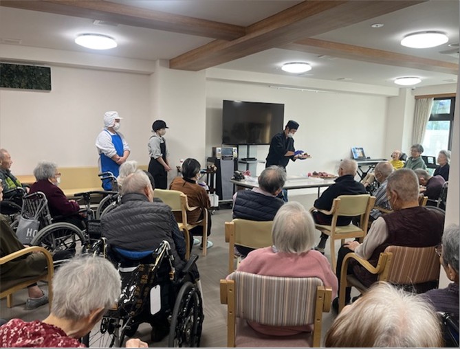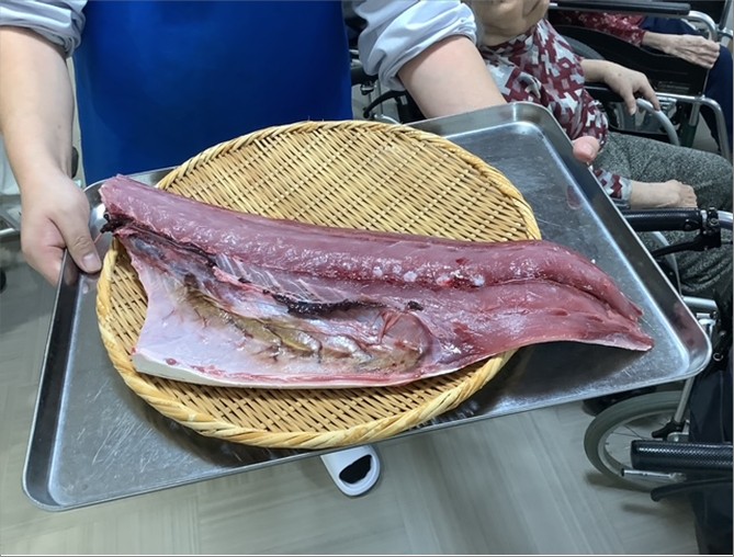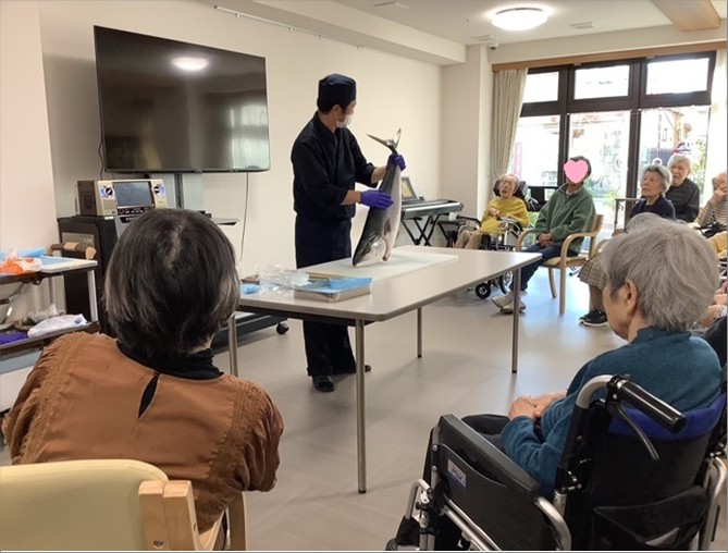 ご報告が遅れてしまいましたが、、、、1Fフロアにて、普段の食事を作ってくれているアイフーズの熟練のプロ職人が鰤の説明を織り交ぜ、豪快な包丁さばきを見せてくれました!!