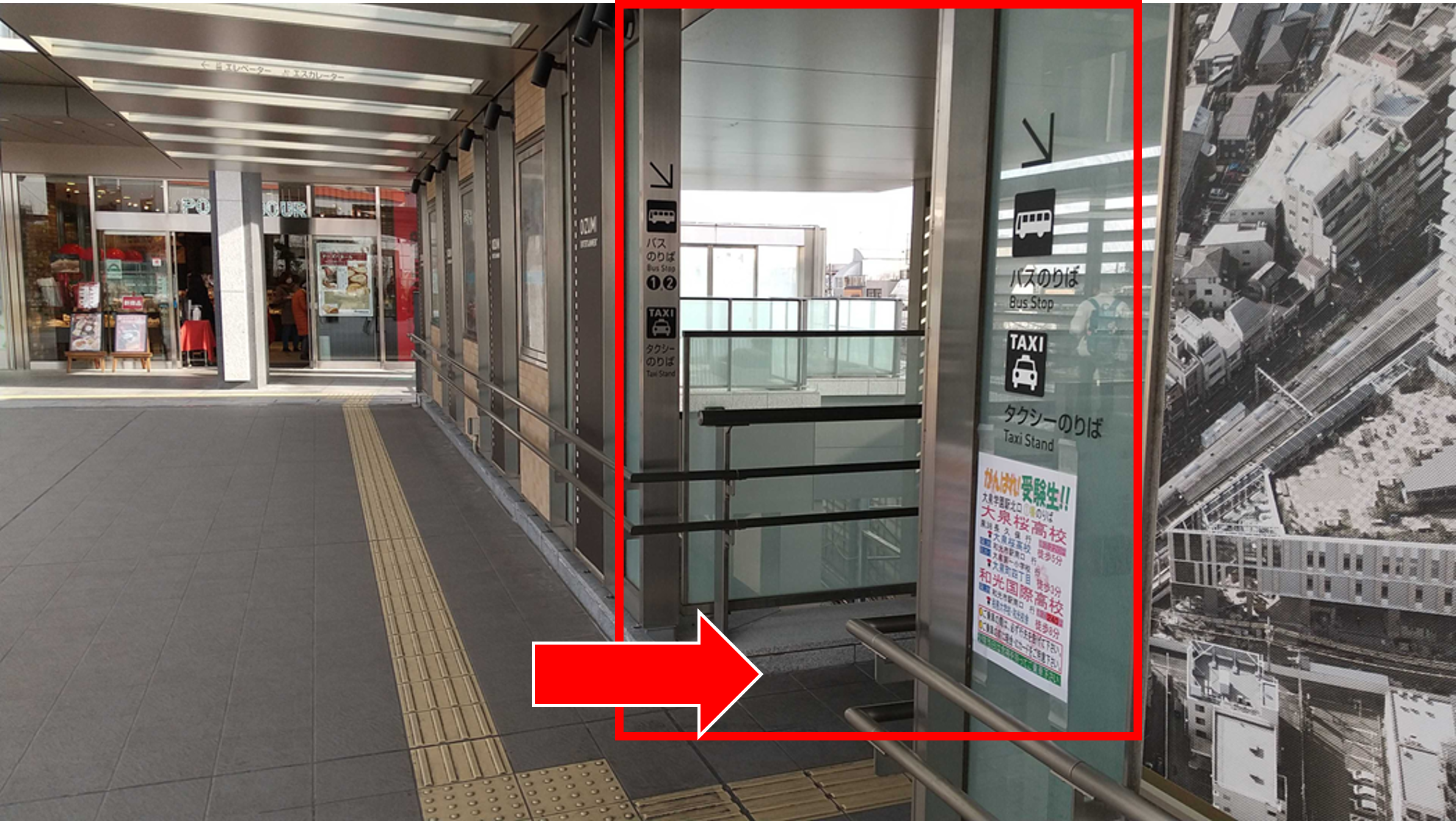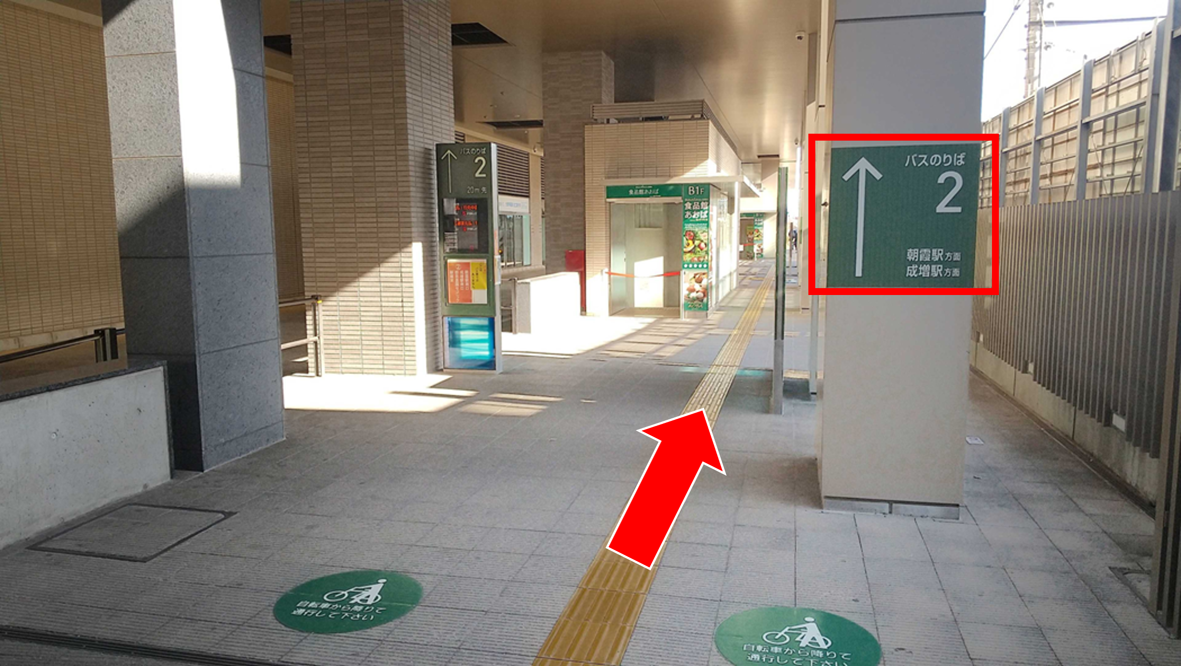 ④階段を下りるとバス停があります。そのまま直進し、【2番口】に向かいます。