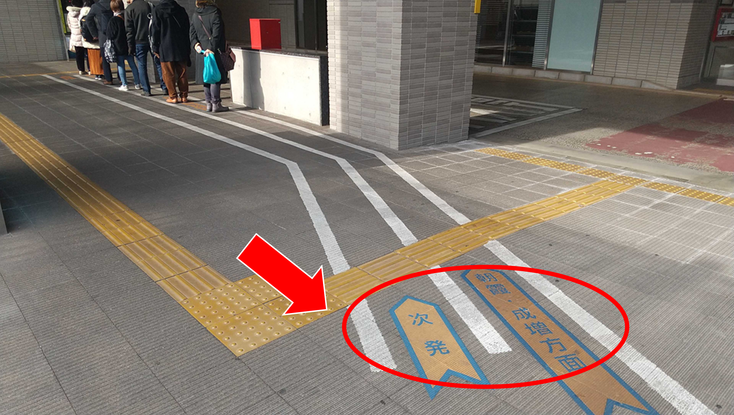 ⑤【2番口】は並ぶ箇所が2列ありますが、「道路面側が先発」「歩道面側が次発」となります。