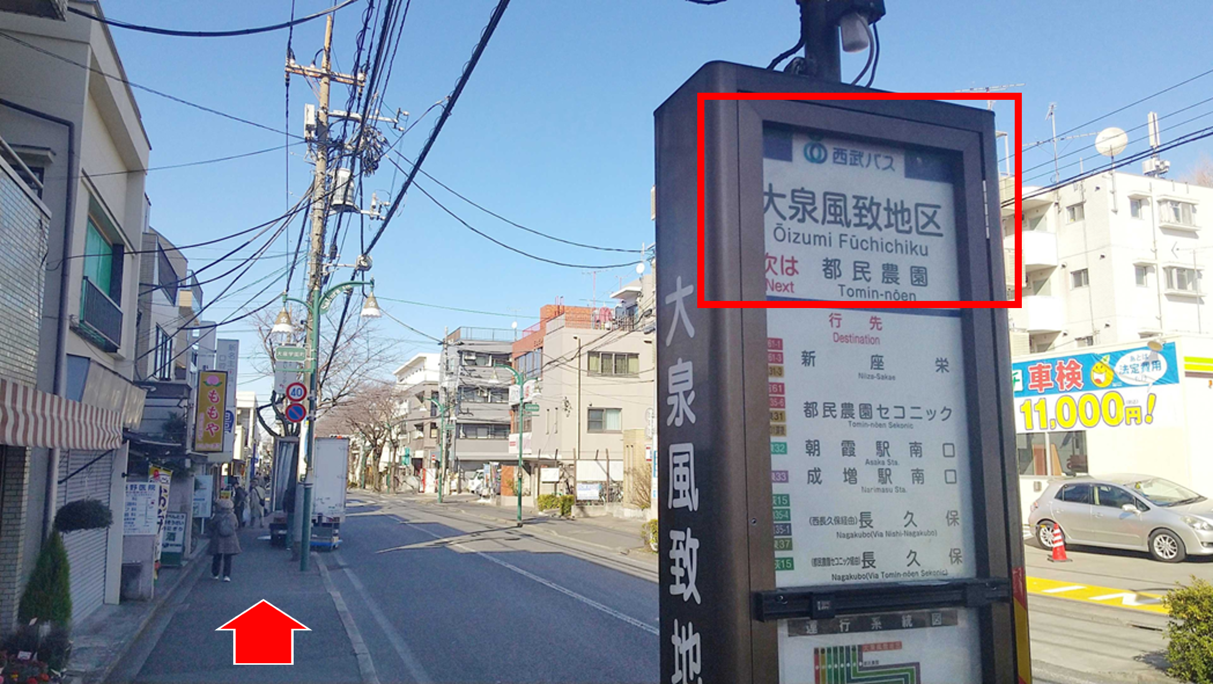 ⑦バス停【大泉風致地区】で降車します。大泉学園駅を背にバスの進行方向に合わせて約100m直進します。