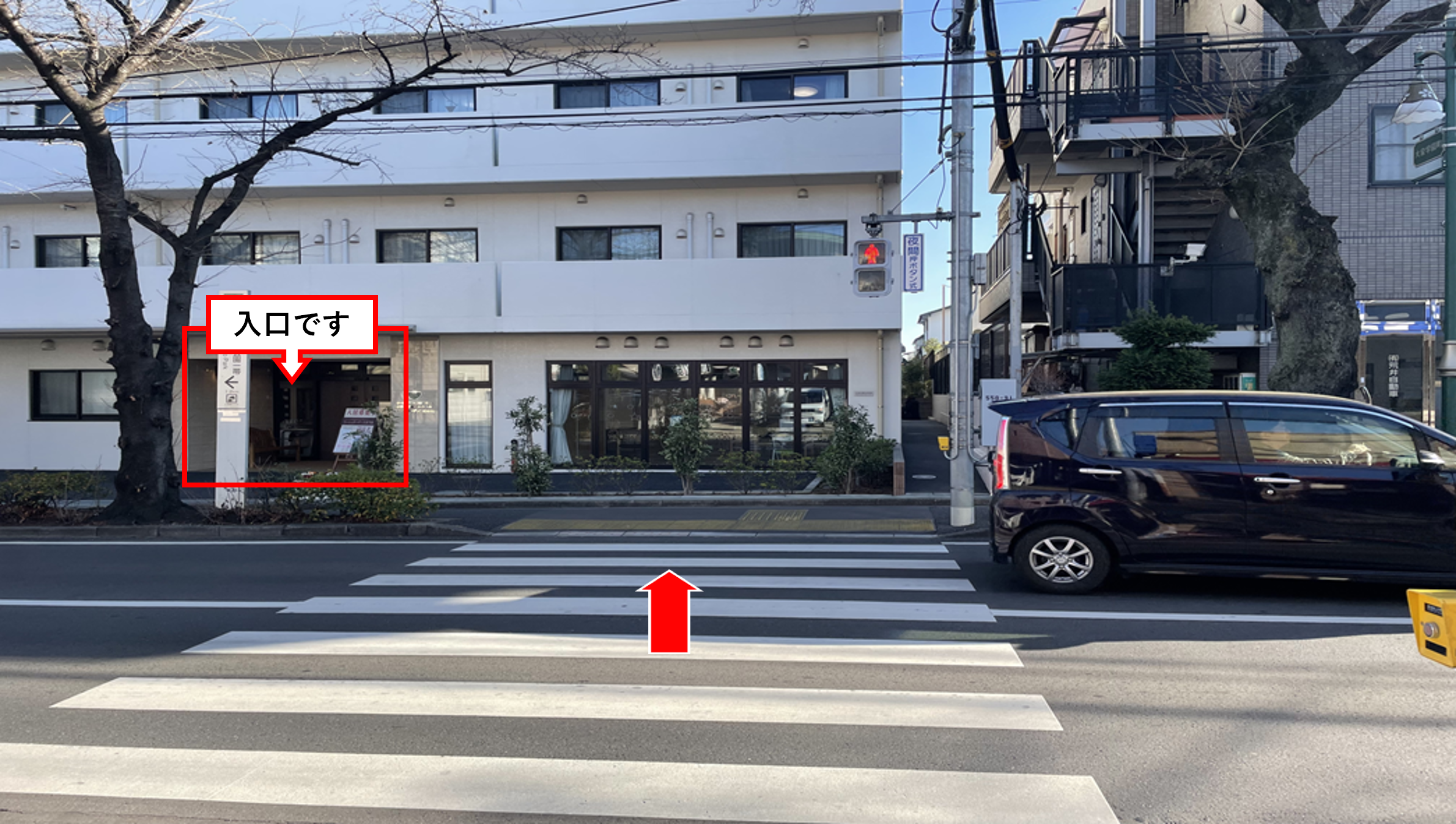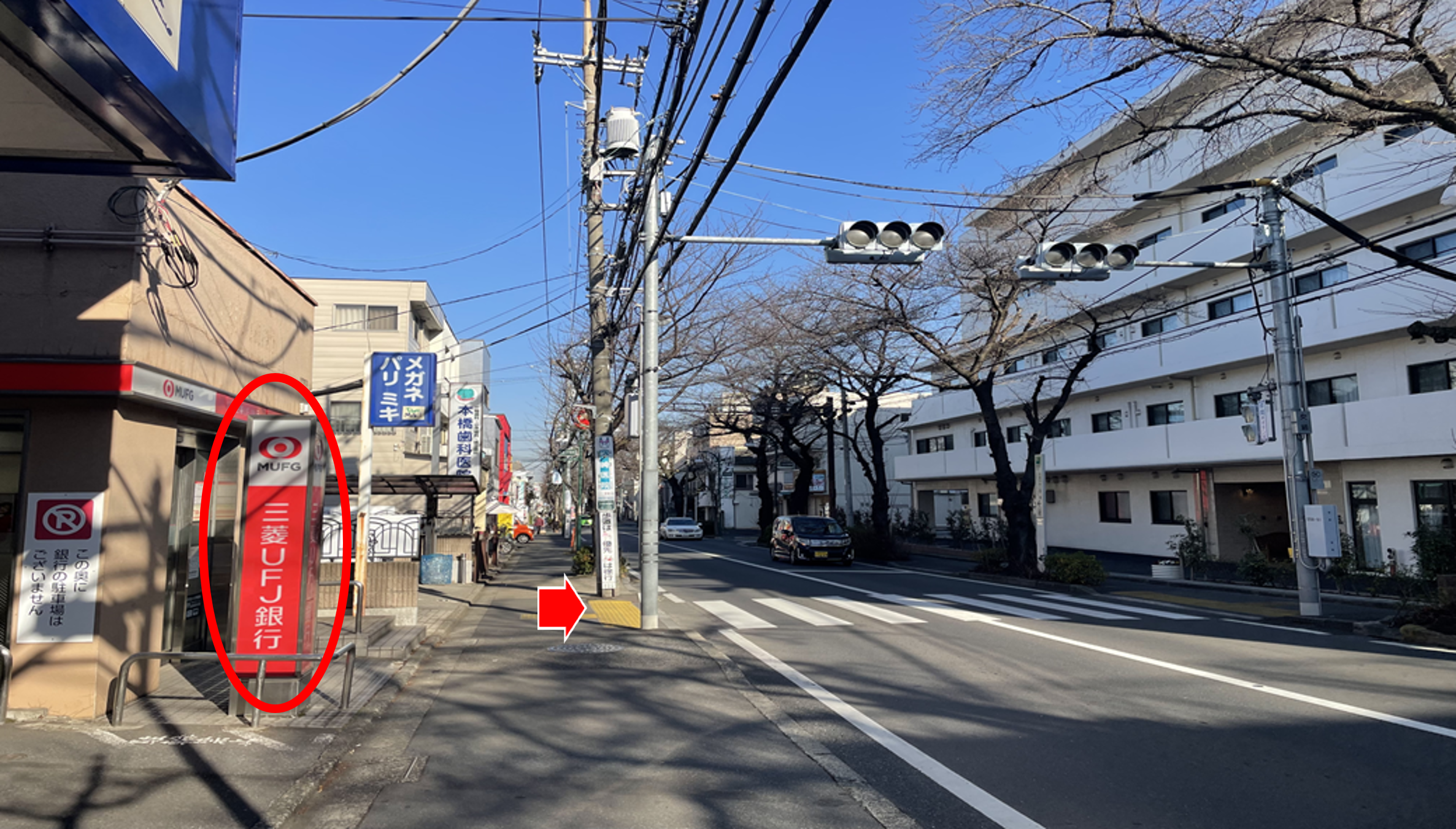 ⑧左手に三菱UFJ銀行(ATM)の看板が見えましたら目の前の横断歩道を渡ります。