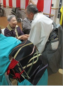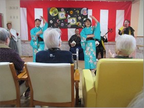 ボランティアの「桜毘会」様をお招きし、尺八と三味線の演奏、歌と太鼓に合わせた踊りを披露してくださいました!