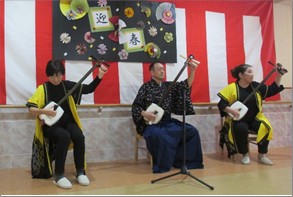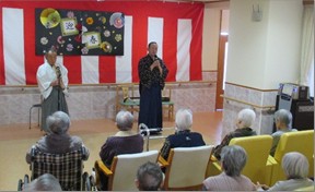 ボランティアの「桜毘会」様をお招きし、尺八と三味線の演奏、歌と太鼓に合わせた踊りを披露してくださいました!