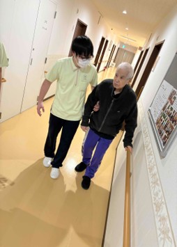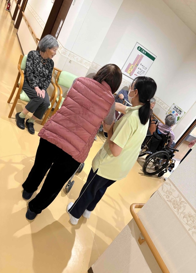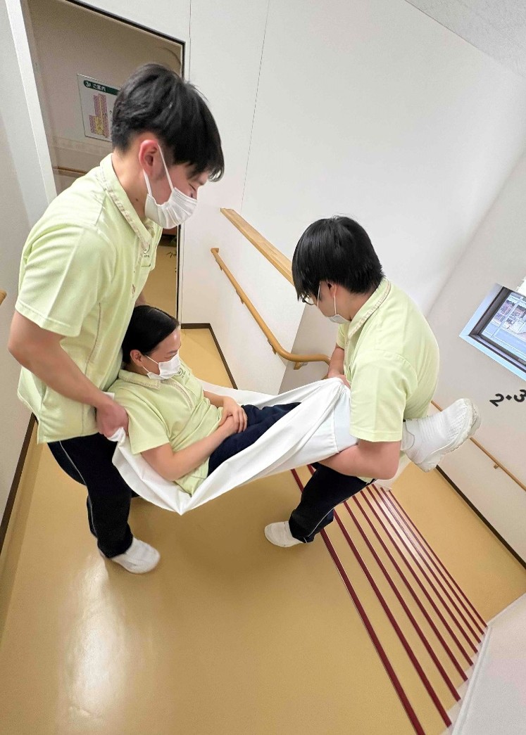 歩行が困難な入居者様を階段から避難する想定も行いました。