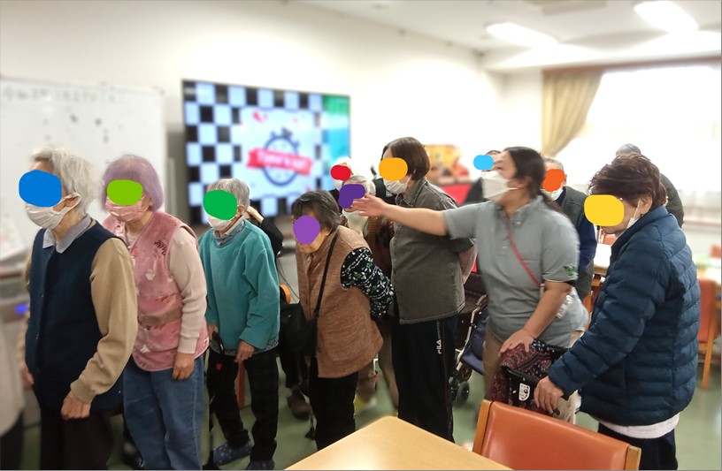 午後のレクリエーション中に火災が発生した想定で、火災の連絡を受けると、職員は直ちにご利用者様を火元から最も遠い出入り口付近へ誘導します。