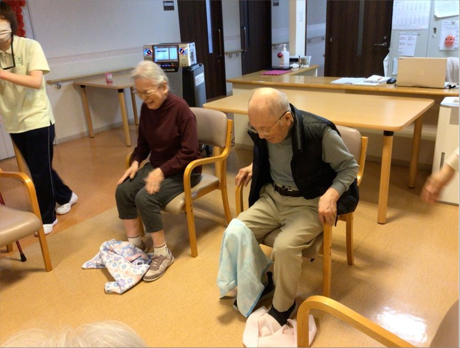 椅子に座った状態で両膝にタオルを掛け、足を動かしてタオルを落とすゲームです!