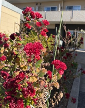 『リーシェガーデン和光/南館』の庭には、小さな赤い菊が咲いています。