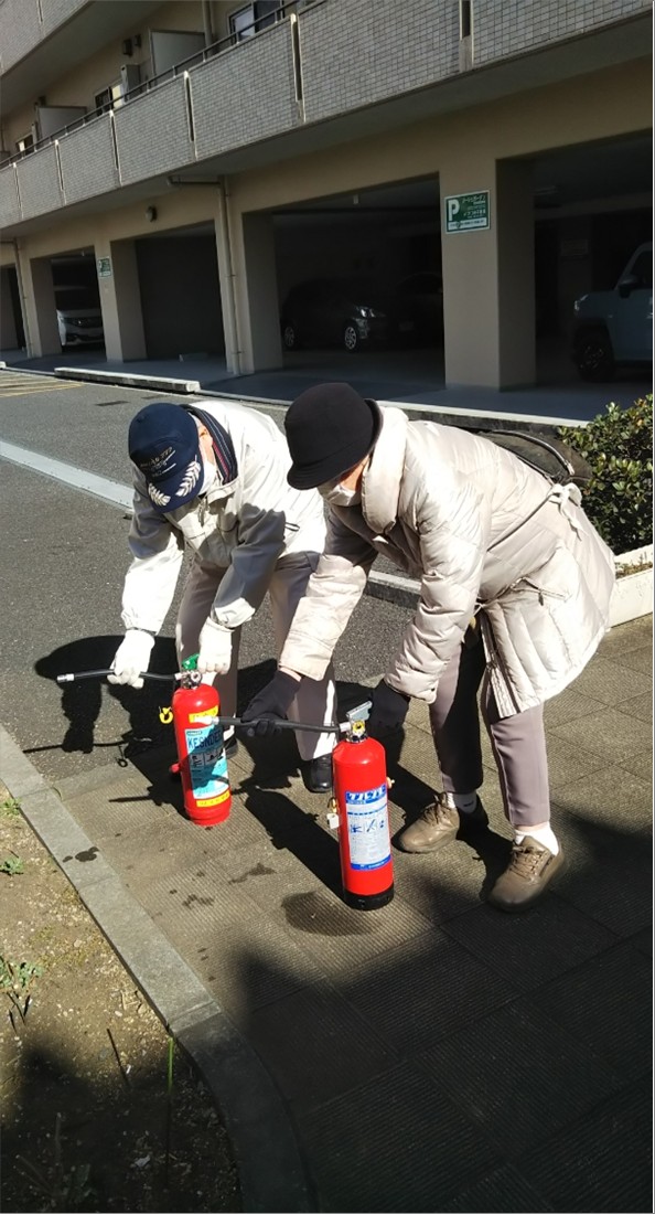 第1弾は消火器の体験を行いました。消火器を初めて使った方が多く、皆様真剣に取り組まれていました。