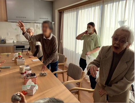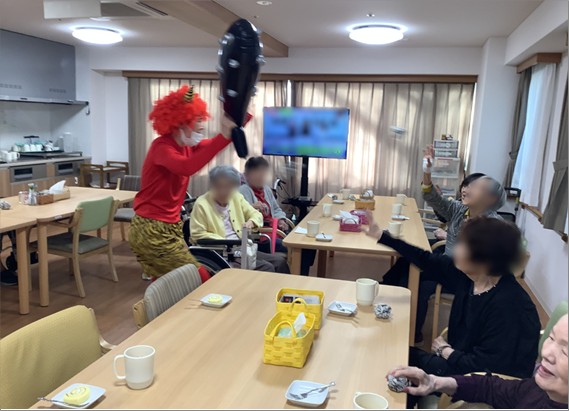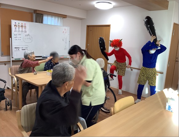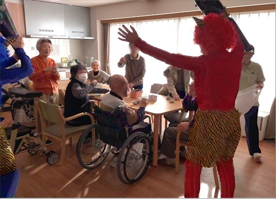 いよいよ鬼退治が始まると入居者様が豆に見立てた丸めた新聞紙を握りしめ「鬼は~外~🎵」「福は~内~🎵」と次々と鬼に向かって力いっぱい投げていました。(丸めた新聞紙も前日に入居者の皆様で作成しました)