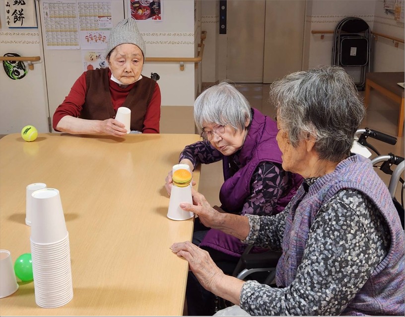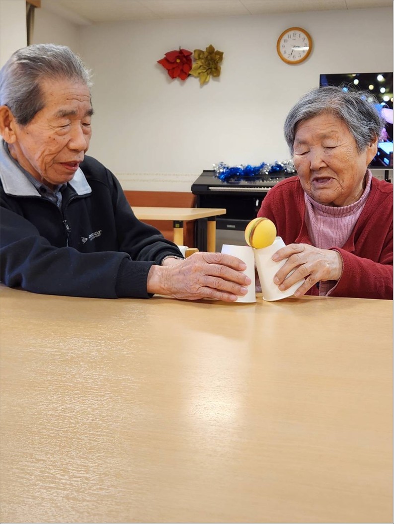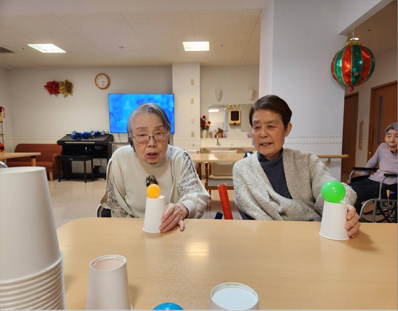 受け渡しの際はお互いにコップの角度を調節しなければ勢いの付いた玉が飛び出すため協力が必要となります。