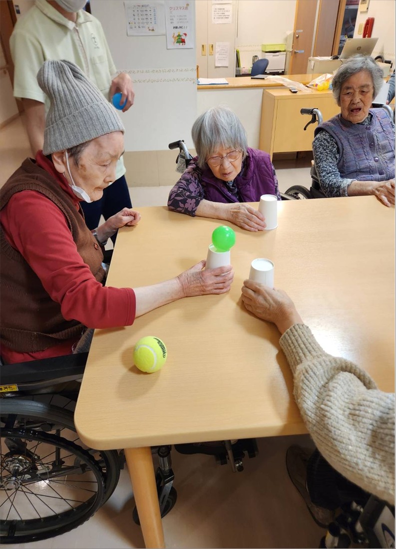 紙コップの底裏で各種ボールを隣へと受け渡しを行っていきます。