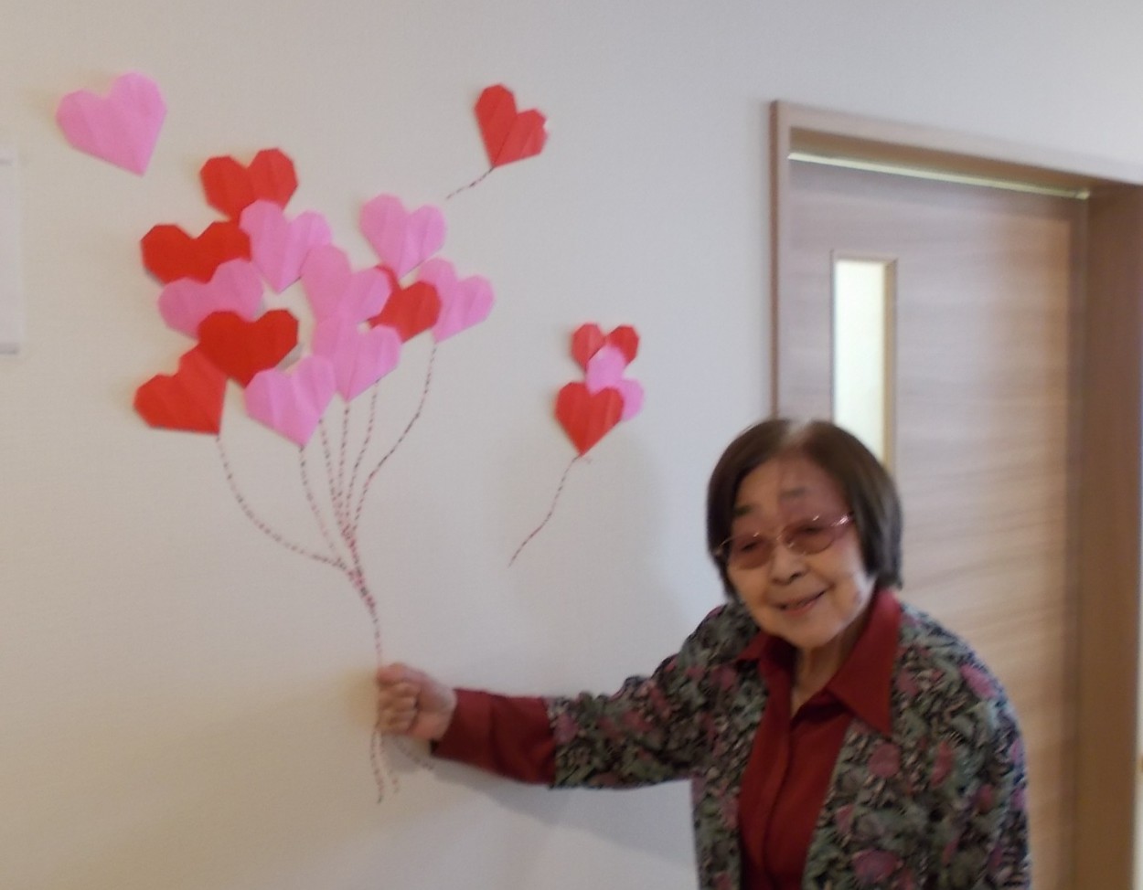 せっかく作った飾りですので、入居者様に壁の前に立って頂き、記念撮影を行いました📷