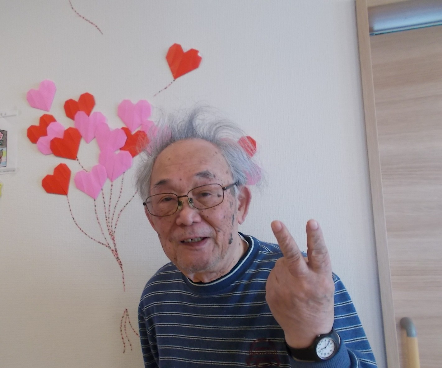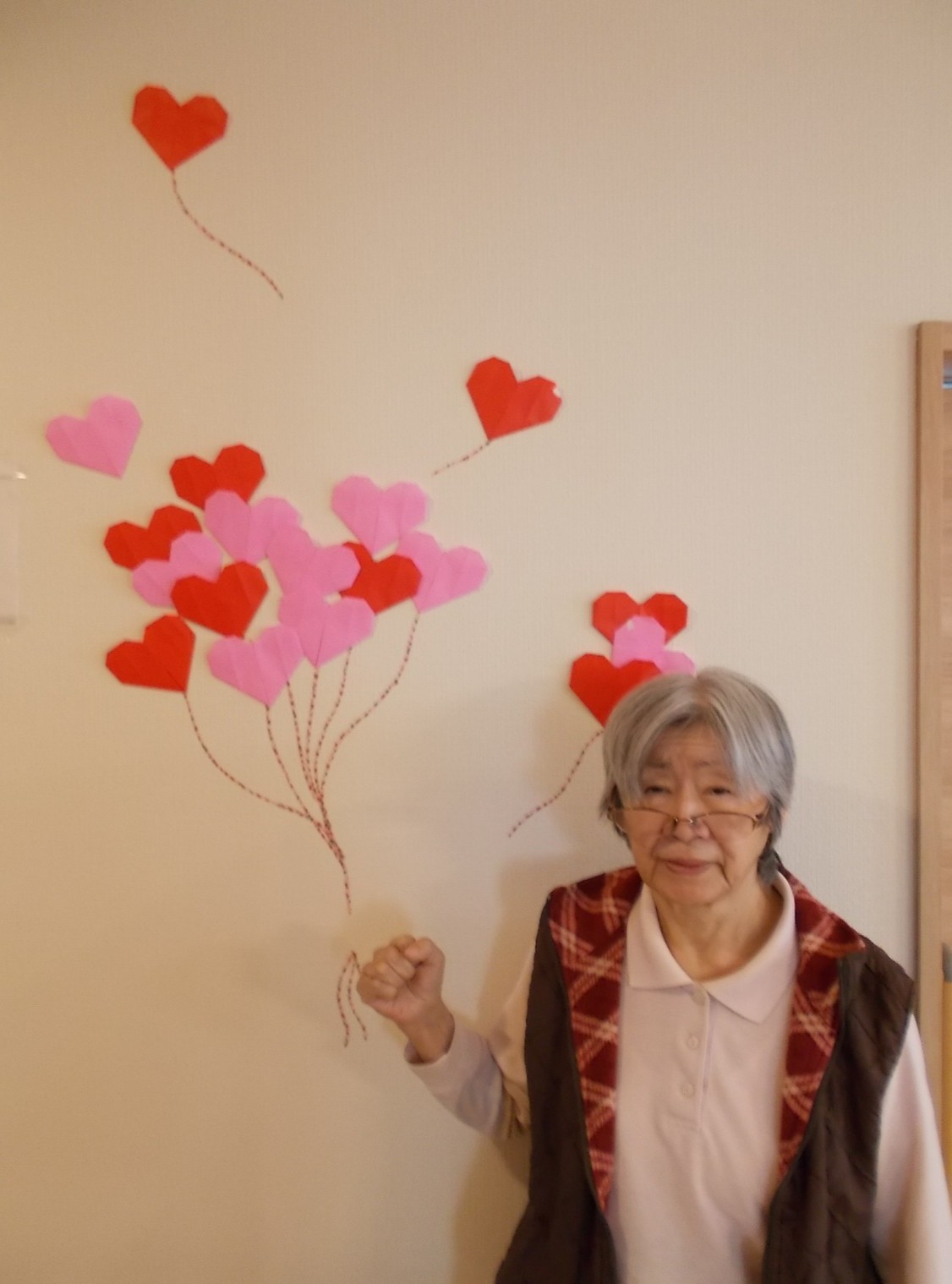 せっかく作った飾りですので、入居者様に壁の前に立って頂き、記念撮影を行いました📷