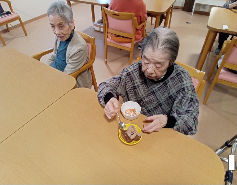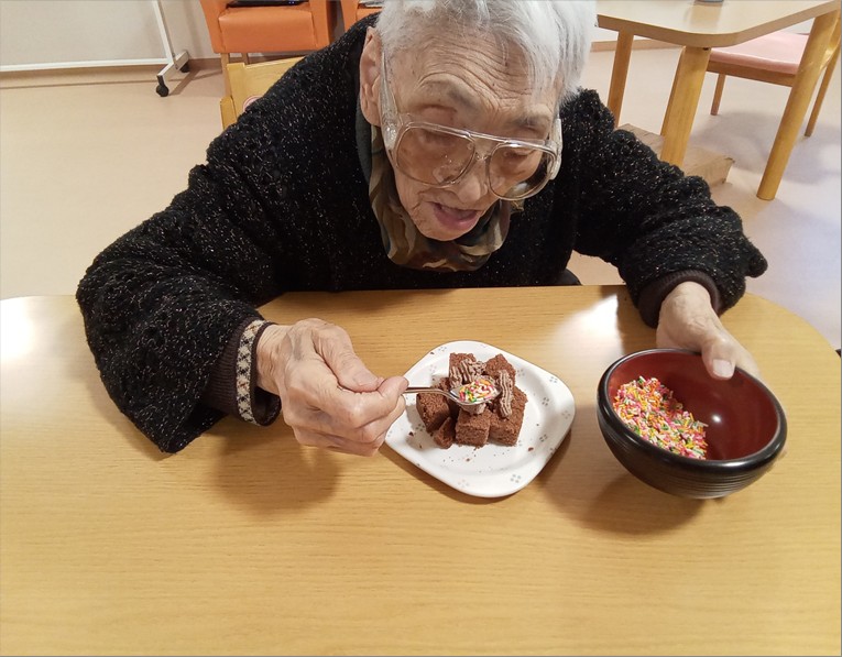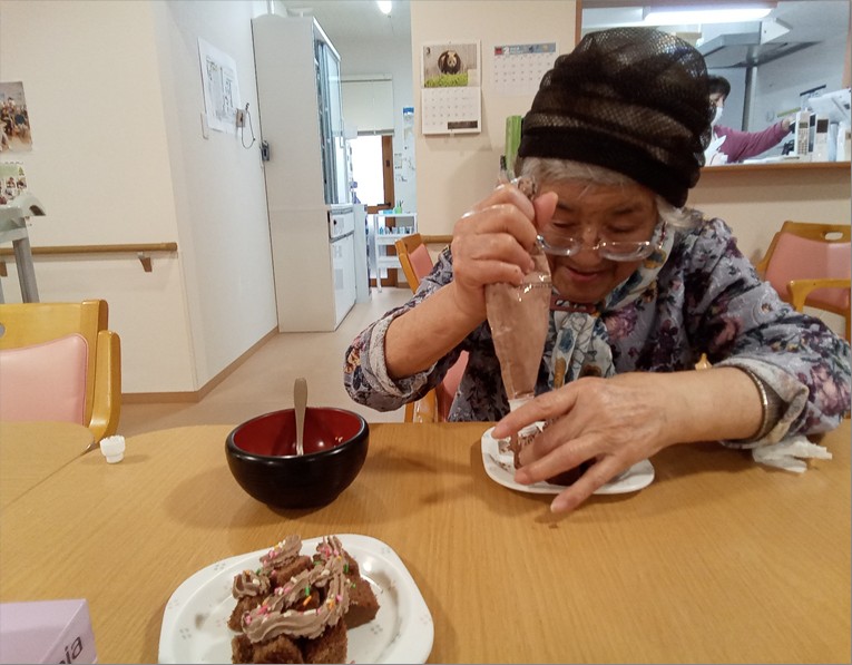 手作りおやつは、バレンタインデーにちなんでチョコレートケーキのデコレーションを行いました♡