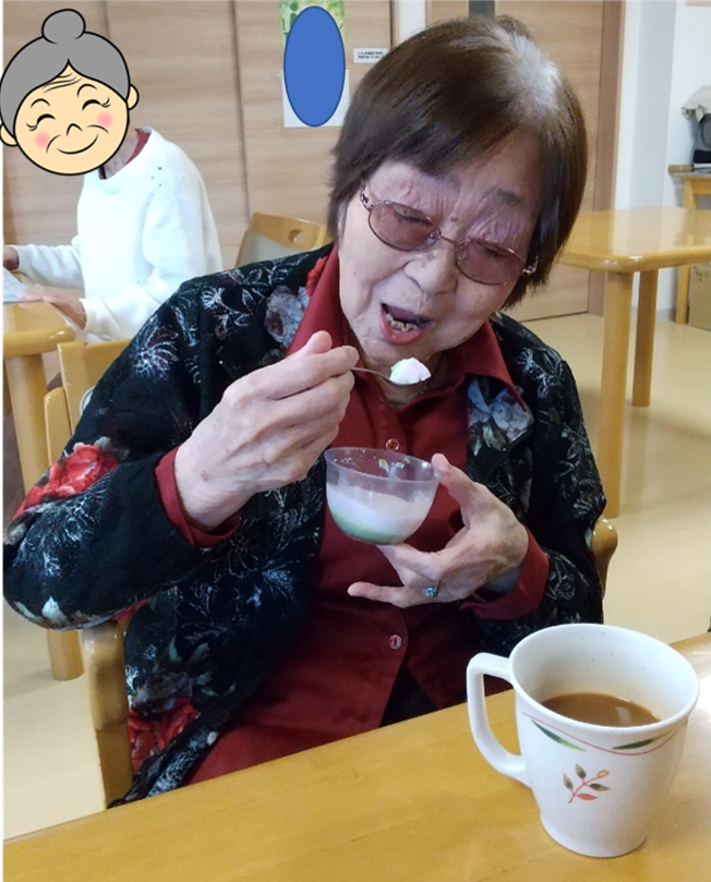 午後のおやつの三色ババロアです!きれいですね。ちなみにこれは、ひし餅をモチーフにしています。
