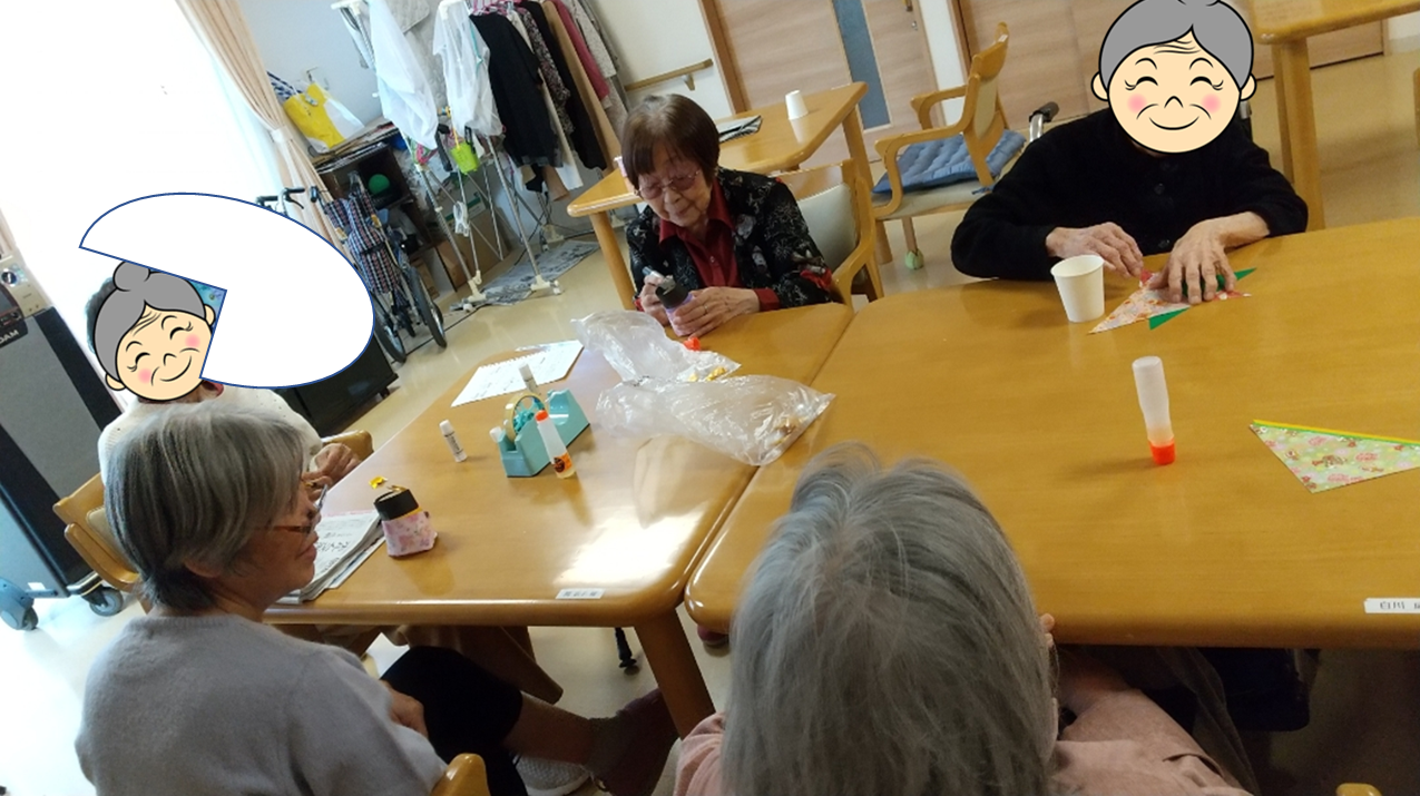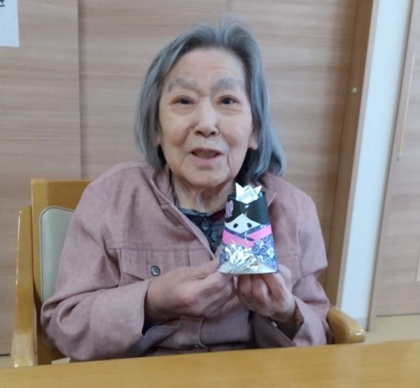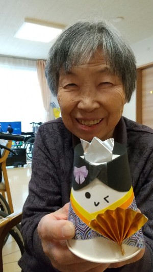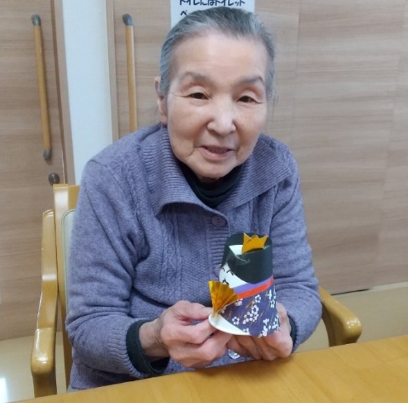 入居者様に各々お好きな色・柄の折り紙を選んで頂き、お雛様の着物にしました。仕上げに顔を描き、お好みでシールを貼り付けて完成です♪